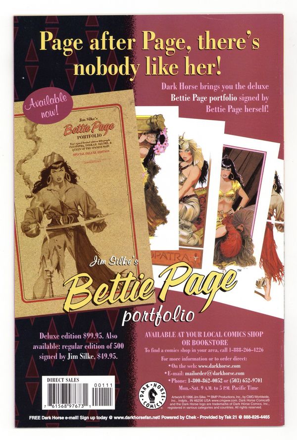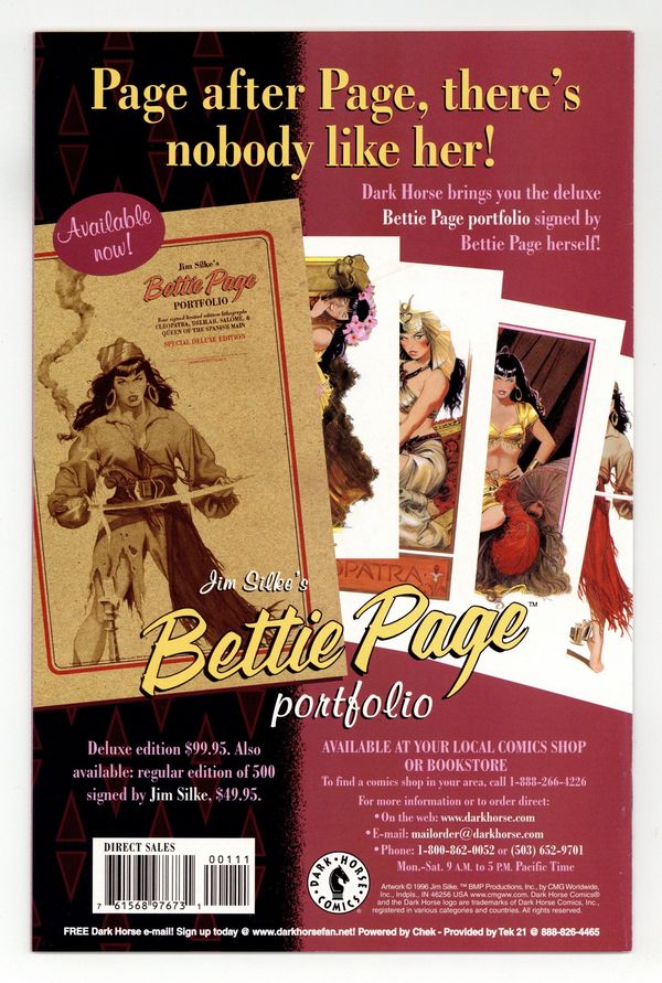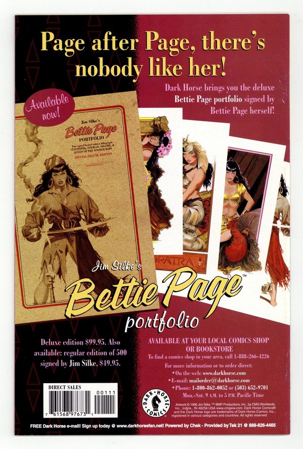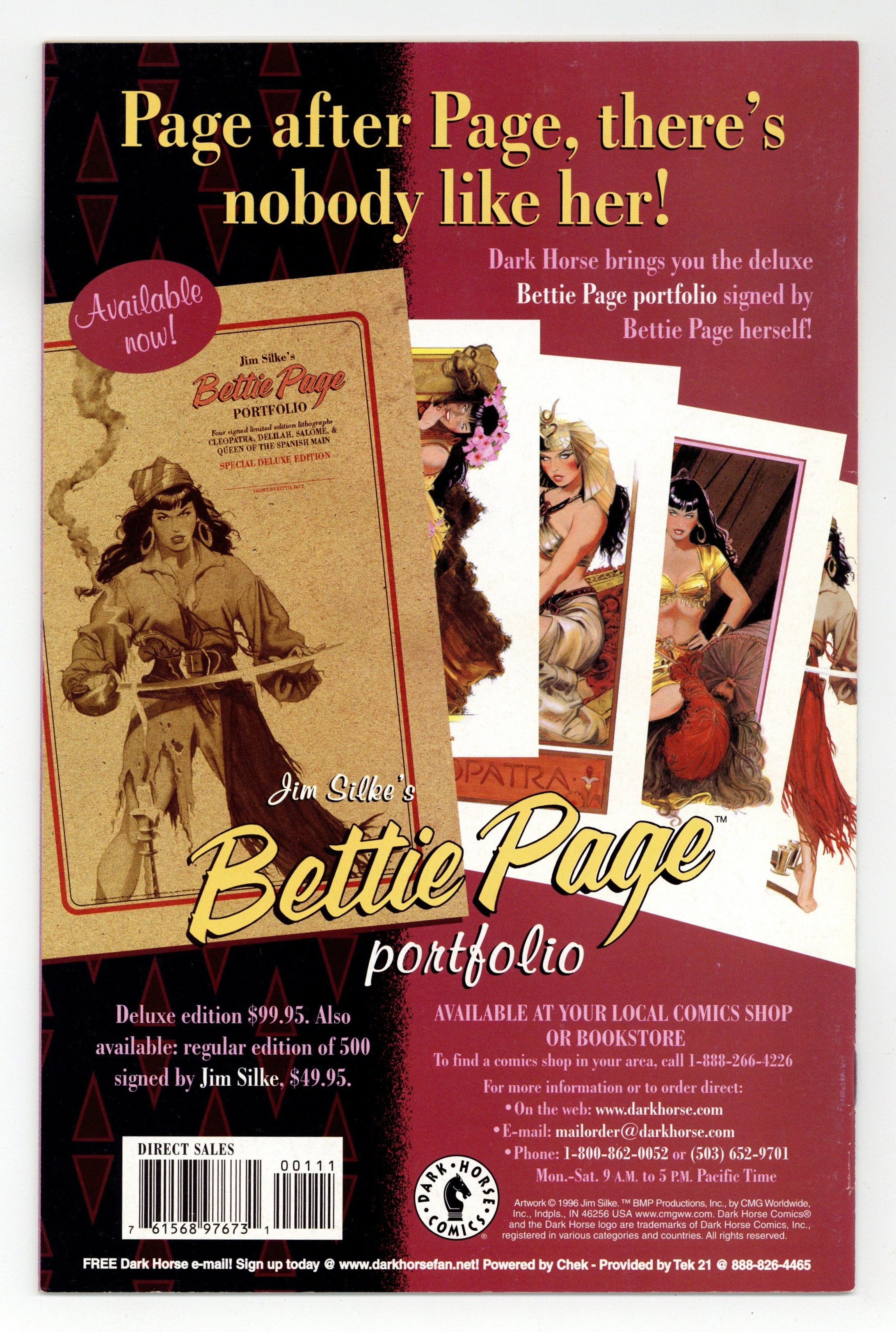 Published Dec 1999 by Dark Horse.$57.00by Jim Silke; cover by Dave Stevens Bettie's back! And she's right where she belongs: in all kinds of trouble! This time, it's a low-budget time machine that mistakenly transports her to ancient Egypt where she battles the High Priest of Amon Ra, assorted thugs, and a lovesick mummy twice her size. She wiggles and squirms, and even bumps and grinds, to avoid their evil clutches, but she can't avoid the inevitable: everyone falls in love with her, she loses her clothes (frequently), and gets she thrown into a "bottomless pit" to be buried alive. Jim Silke continues the story he began in Bettie Page: Spicy Adventures, with Dave Stevens as cover artist. On sale December 1 FC, 32pg (1 of 3)" Cover price $2.95.