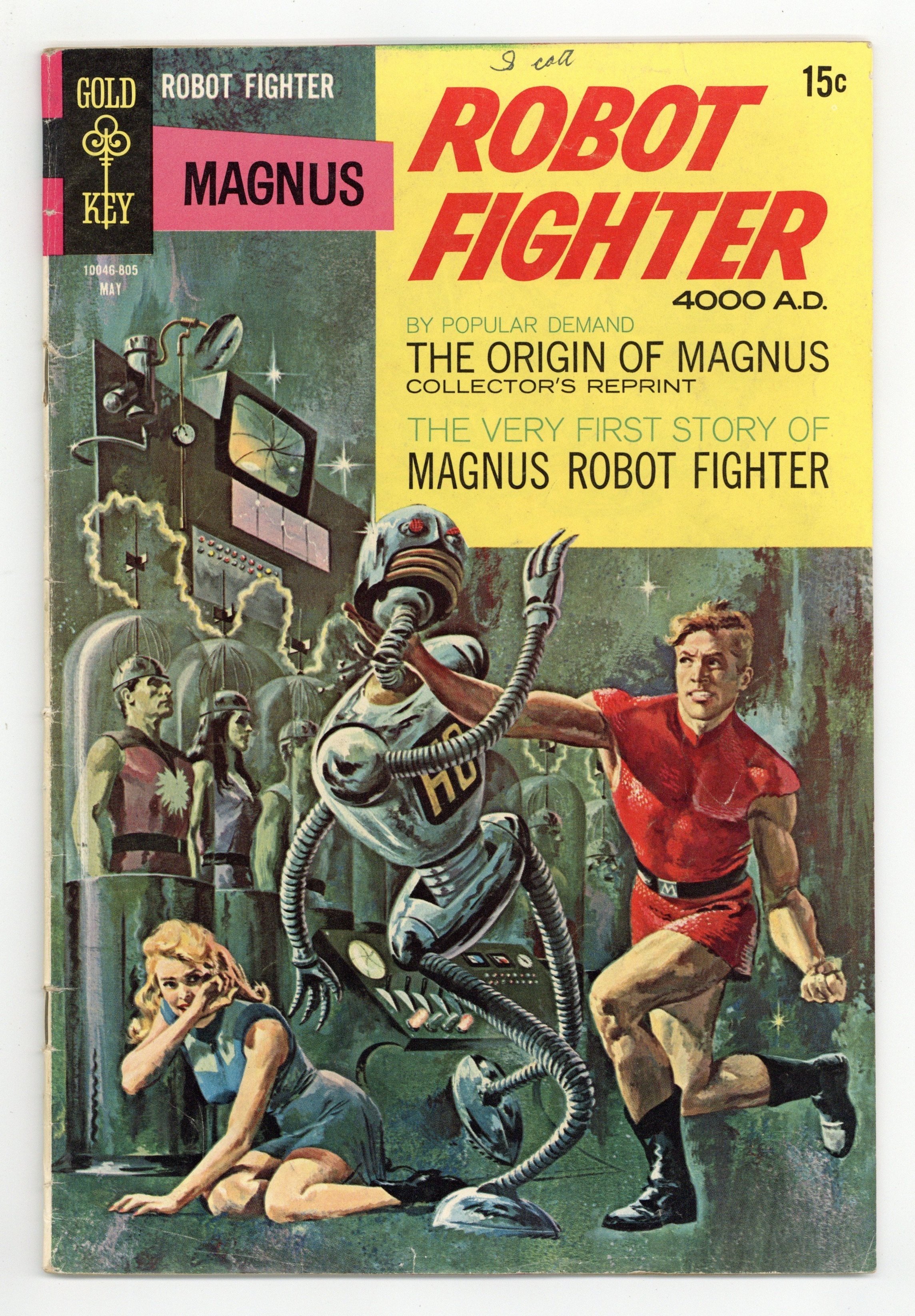 15ยข cover price variant. Painted cover art by Russ Manning. "Magnus, Robot Fighter," script and art by Russ Manning; Reprint of issue number one, the origin of Magnus; Some panels were cut from the original story in this reprint; 1A takes Magnus to North Am where he begins his crusade against evil robots by stopping the Polrob Chief H8. "The Incredible Jewel" starring The Aliens, pencils by Russ Manning. # on cover 10046-805 May #22 5/68. 36 pgs., full color. Cover price $0.12.