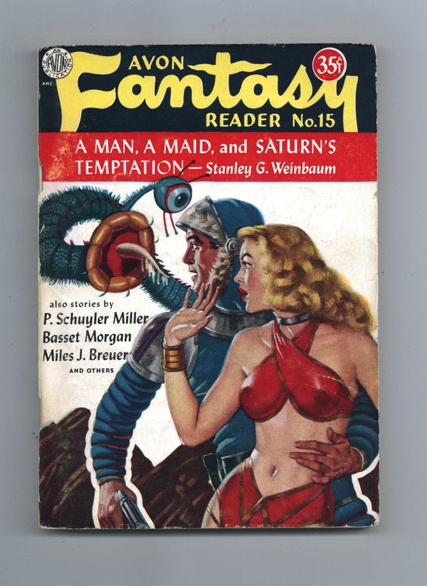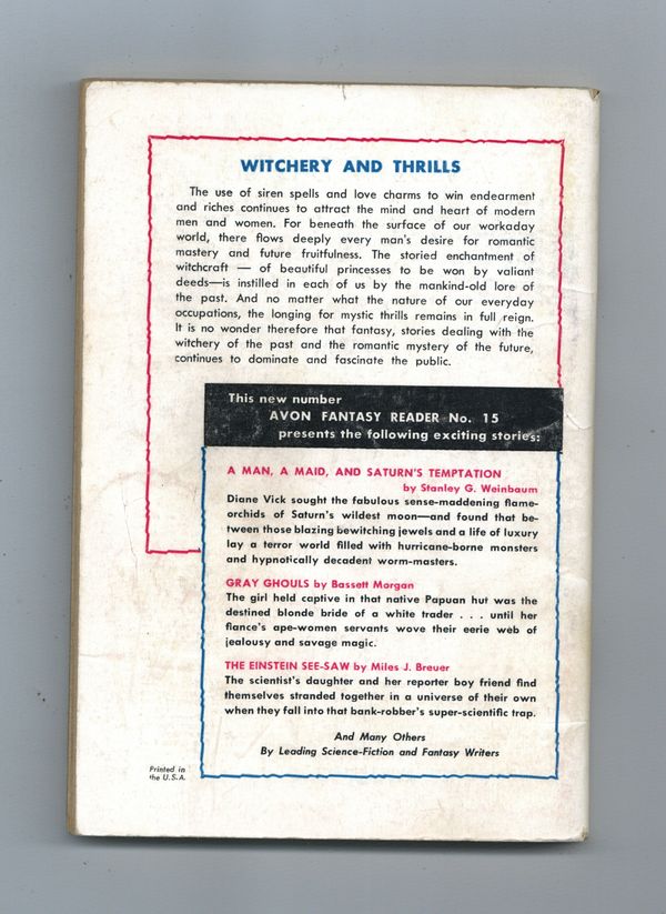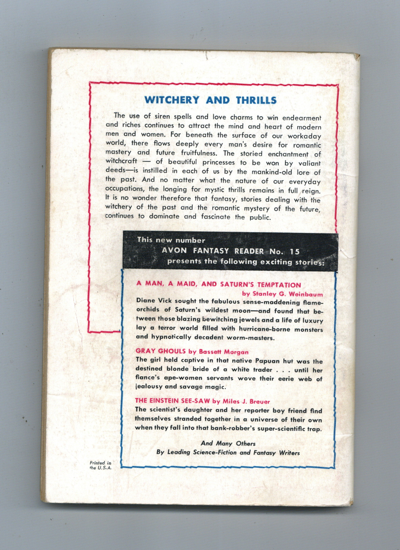 Published 1951 (est.) by Avon Books.$22.00November, 1948. "The Queen of the Black Coast!" Written by Robert E. Howard. Featuring work by Ray Bradbury, Algernon Blackwood, and 'The Temple" by H. P. Lovecraft. Softcover, 5-in. x 7 1/2-in., 132pages, Text with B&W illustations. Cover price $0.35.