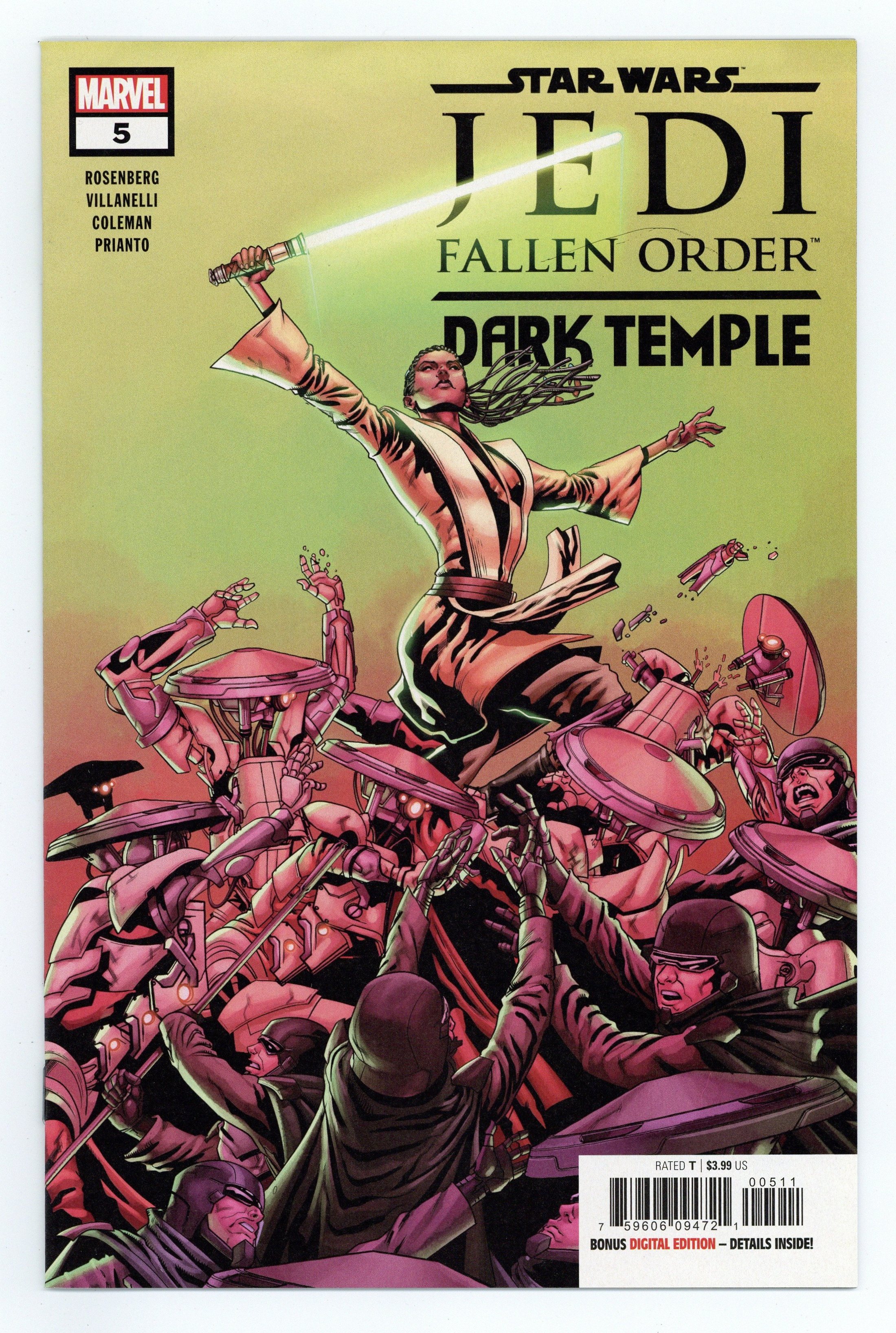 Written by Matthew Rosenberg. Art by Paolo Villanelli and Ruairi Coleman. Cover by Will Sliney. ONE AGAINST A WORLD Jedi Master Eno Cordova will have to use all his wits and training if he hopes to survive the mysteries of the Dark Temple! Meanwhile Jedi Padawan Cere Junda strikes a blow in the hopes of ending the battle with the Daa Corporation's army. But was it too late? If Cordova and Junda hope to survive they're going to need to get off Ontotho. And they can't do that alone! It all ends here! Read the shocking conclusion to the epic comic series featuring characters from the videogame STAR WARS JEDI: FALLEN ORDER. 28 pages, full color. Rated T Cover price $3.99.