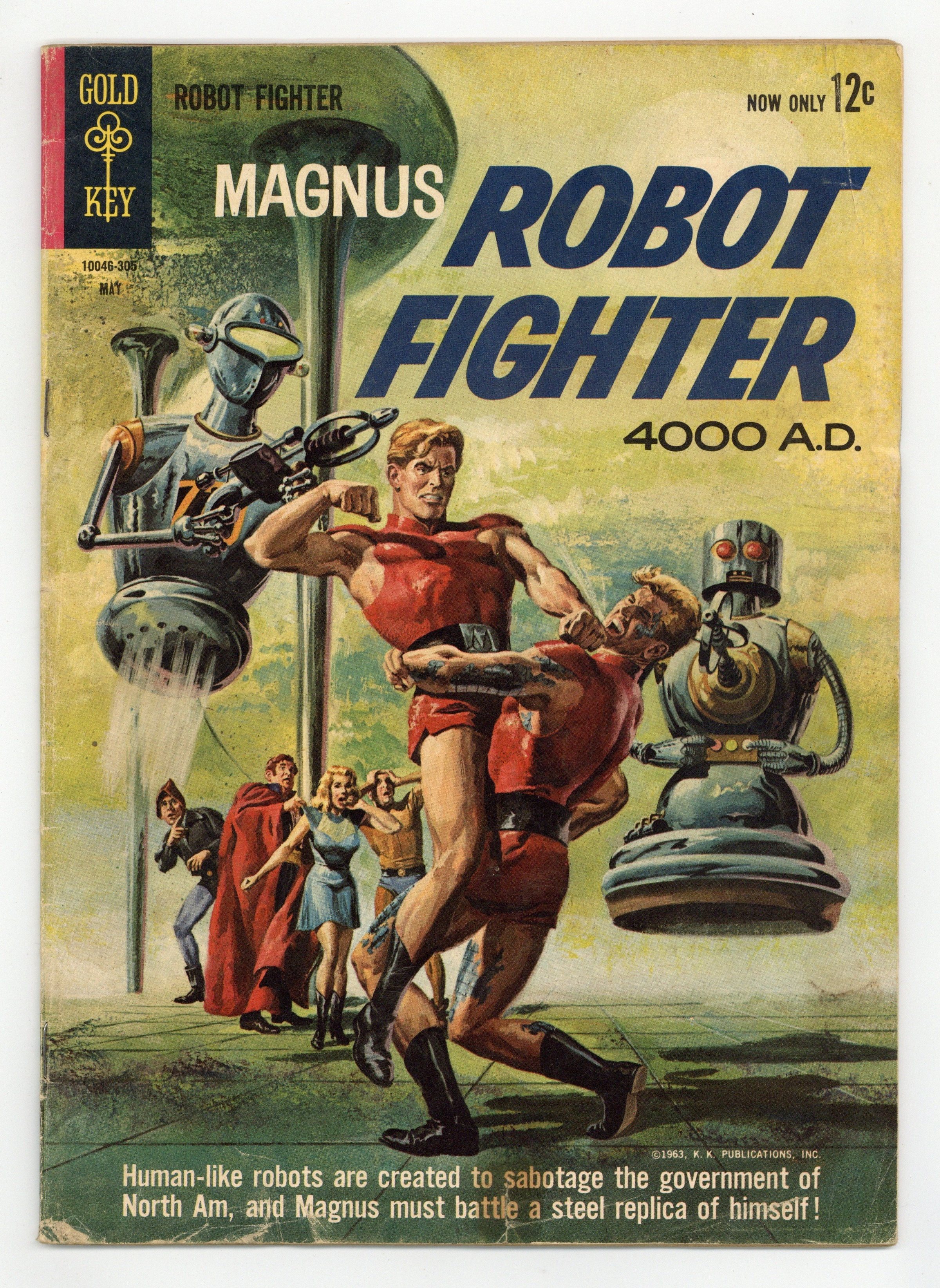 Painted cover art by George Wilson. "Trees, Number 7: Palms" article. "Operation Disguise," script by Russ Manning, Robert Schaefer, and Eric Freiwald, art by Russ Manning; Human-like robots are created to sabotage the government of North Am, and Magnus must battle a steel replica of himself. "The World of Robots... Today!" article. "Space Derelict," script by Robert Schaefer and Eric Freiwald, art by Russ Manning; An Earth-bound ship raises shields against meteors and finds a derelict Earth ship; Captain Johner goes aboard, finds air, but is hit from behind; Rodg and an Alien Og venture aboard; Rodg is struck down but Og grabs the perpetrator: an Earthman driven mad by loneliness. "Trees, Number 8: Cedar" article, art by Jack Sparling. Robot Fighter Pin-Up No. 2 back cover painting by George Wilson. # on cover 10046-305. May. #2 5/63. 36 pgs., full color. Cover price $0.12.