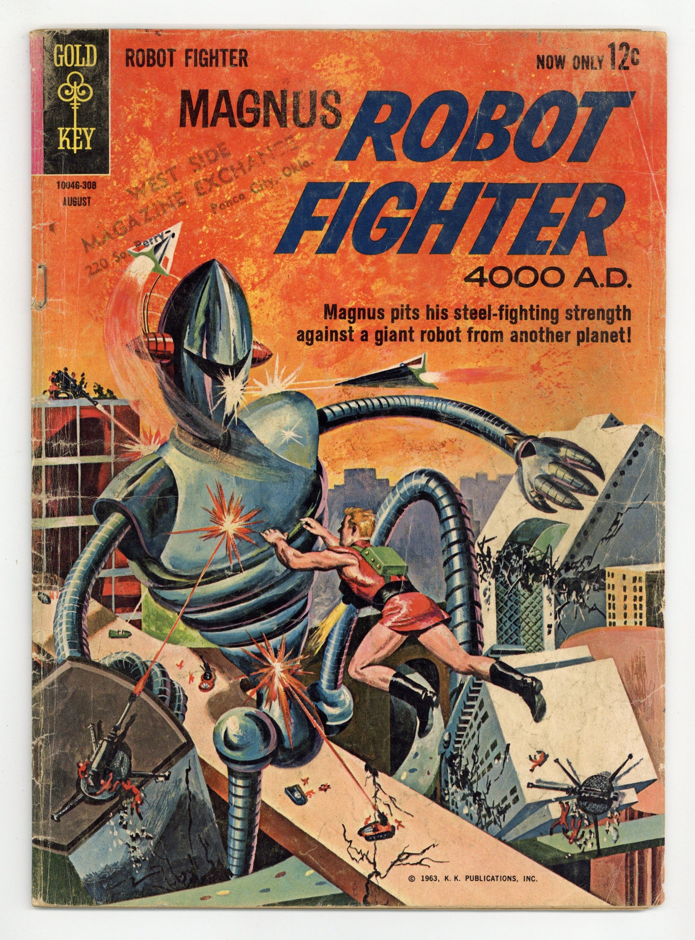 Painted cover art by Russ Manning. "Atomic Energy, Number 1: Identifying the Atom" article. "Giant from Planet X," script by Robert Schaefer and Eric Freiwald, art by Russ Manning; Magnus pits his steel-fighting strength against a giant robot from another planet. "A Matter of Judgment," script by Robert Schaefer and Eric Freiwald, art by Russ Manning; Aboard the Earth-bound ship, Captain Johner teaches Zarz how the ship runs; Two crewmen object to the "creatures" and distrust them; Later the ship is attacked by (some unknown ship's) missiles. "Atomic Energy, Number 2: The Composition of the Atom" article. Robot Fighter Pin-Up No. 3 back cover art by Russ Manning. # on cover 10046-308. August. #3 8/63. 36 pgs., full color. Cover price $0.12.