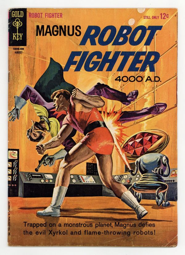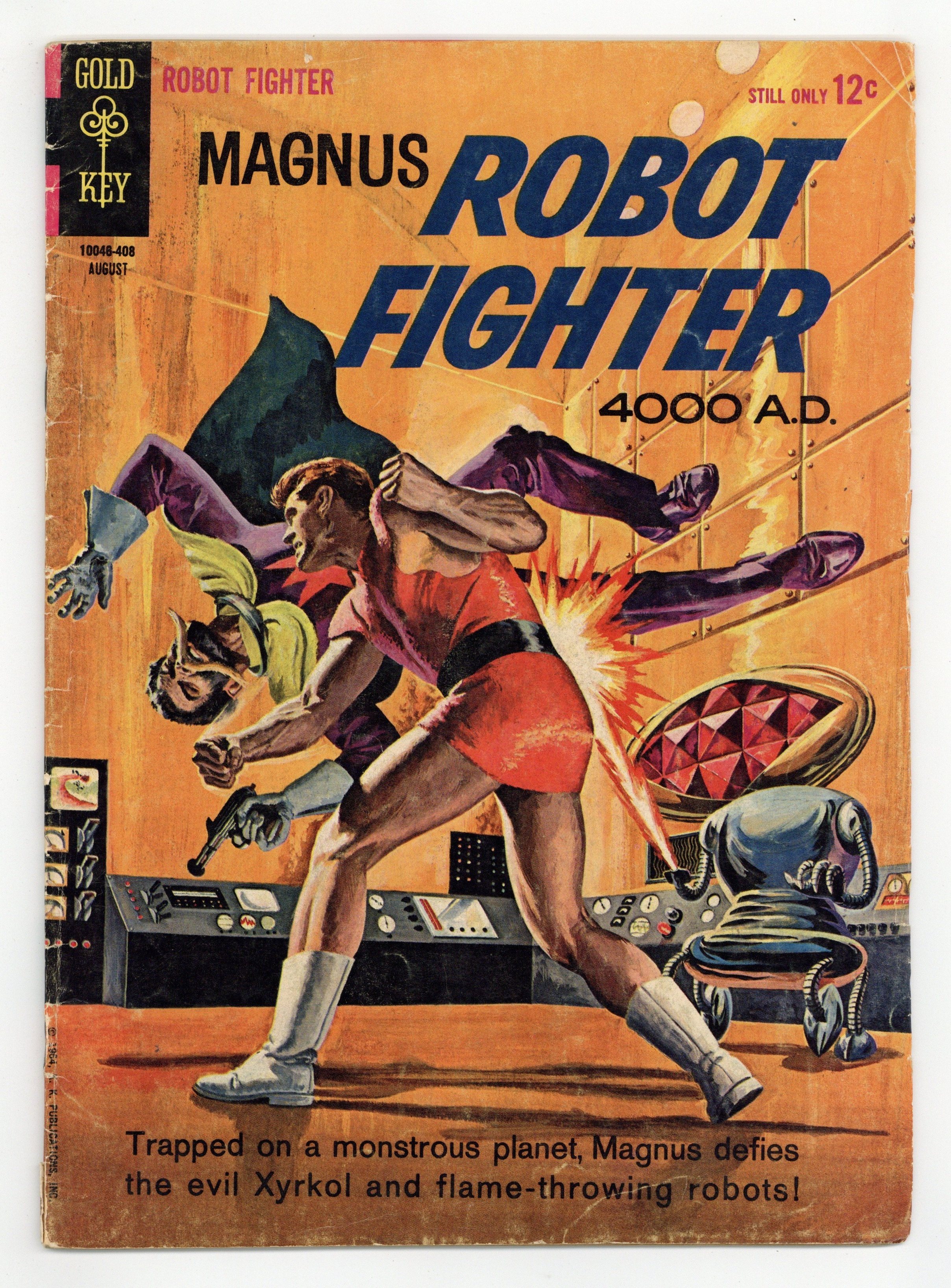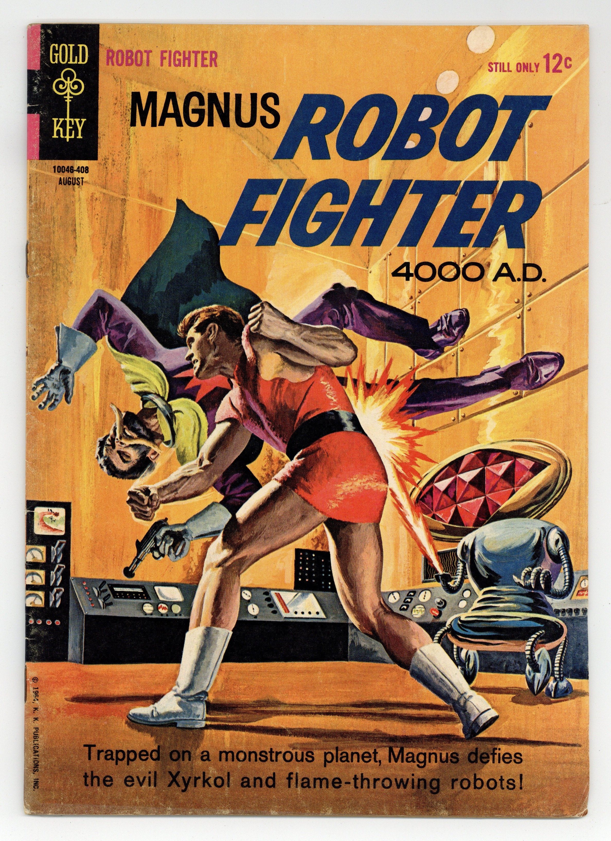 Painted cover art by George Wilson. "Atomic Energy, Number 8: Half-Life of an Element" article. "The Power of the One Thousand," script and art by Russ Manning; Trapped on a monstrous planet, Magnus defies the evil Xyrkol and flame-throwing robots. "The Dream Makers," script and art by Russ Manning; After two years, the Alien-bound ship reaches home; The Earthmen are amazed at the honor: first to visit an alien planet!; Yet Captain Bul warns of "strange appearances" and not to touch anything; The reception has many strange aliens--and two pretty human women! "Fish, Number 33: Carp" article. Robot Fighter Pin-Up back cover painted art by George Wilson. # on cover 10046-408. August. #7 8/64. 36 pgs., full color. Cover price $0.12.