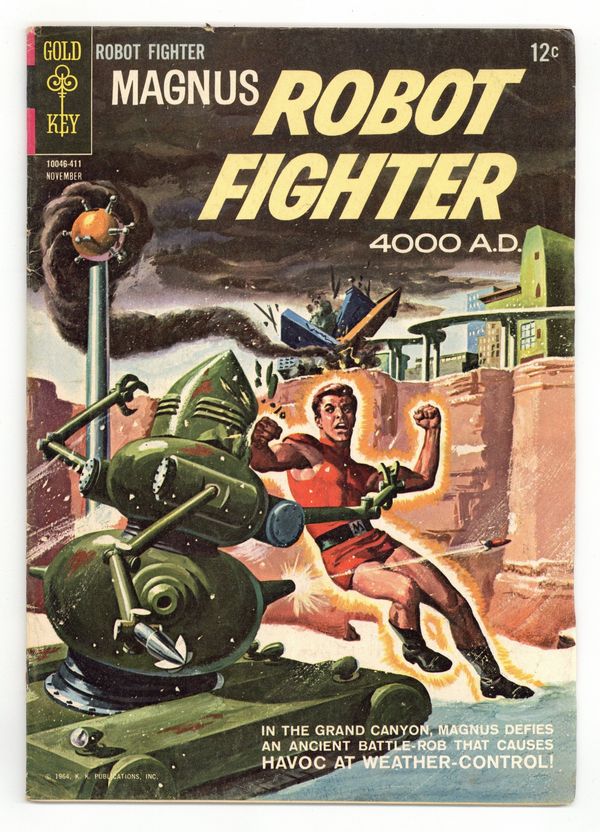 $17.25Painted cover art by George Wilson. "Iron and Steel Number 1 Mining Iron Ore" article. "Havoc at Weather-Control," script and art by Russ Manning; In the Grand Canyon, Magnus defies an ancient Battle-Rob that causes havoc at weather-control. "An Alien Welcome," script and art by Russ Manning; On the Aliens' planet, the Earthmen are treated as honored guests; But some Aliens think they're dangerous spies; The men go sight-seeing after Bul warns of fanatics; Fanatics lead them into an empty chamber and lock itl Gas pours in, pitting their helmets. "People of Europe Number 15 the Danes" article. # on cover 10046-411. November. #8 11/64. 36 pgs., full color. Cover price $0.12.