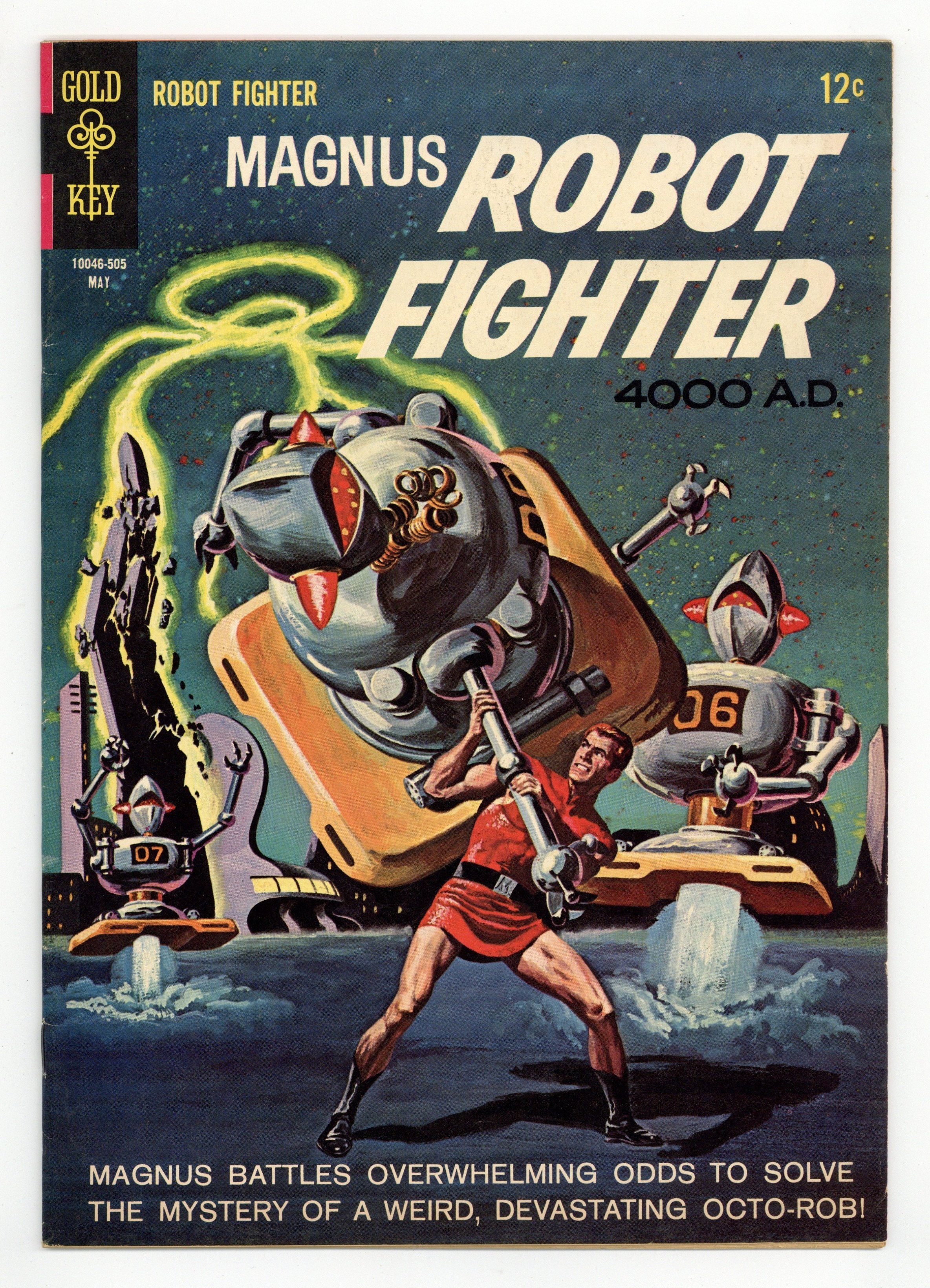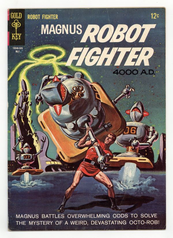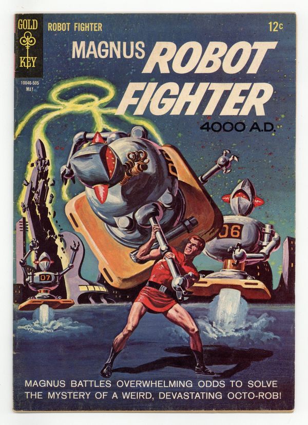 Painted cover art by George Wilson. "The Mysterious Octo-Rob," script by Russ Manning and Don Christensen, art by Russ Manning; Magnus battles overwhelming odds to solve the mystery of a weird, devastating Octo-Rob. "Creatures from Saturn" text story. A Robot Gallery that includes a sketch of a robot invention by a very young Walter Simonson. "Fear of the Unknown," script by Robert Schaefer and Eric Freiwald, art by Russ Manning; Zarz landed the ship after humans passed out, but now the hypatomic engines rupture; Zarz orders "Every Earthman must be outside before any of us leave the ship!" But the rescuers freak at the aliens, and soldiers open fire as the ship burns. # on cover 10046-505. May. #10 5/65. 36 pgs., full color. Cover price $0.12.