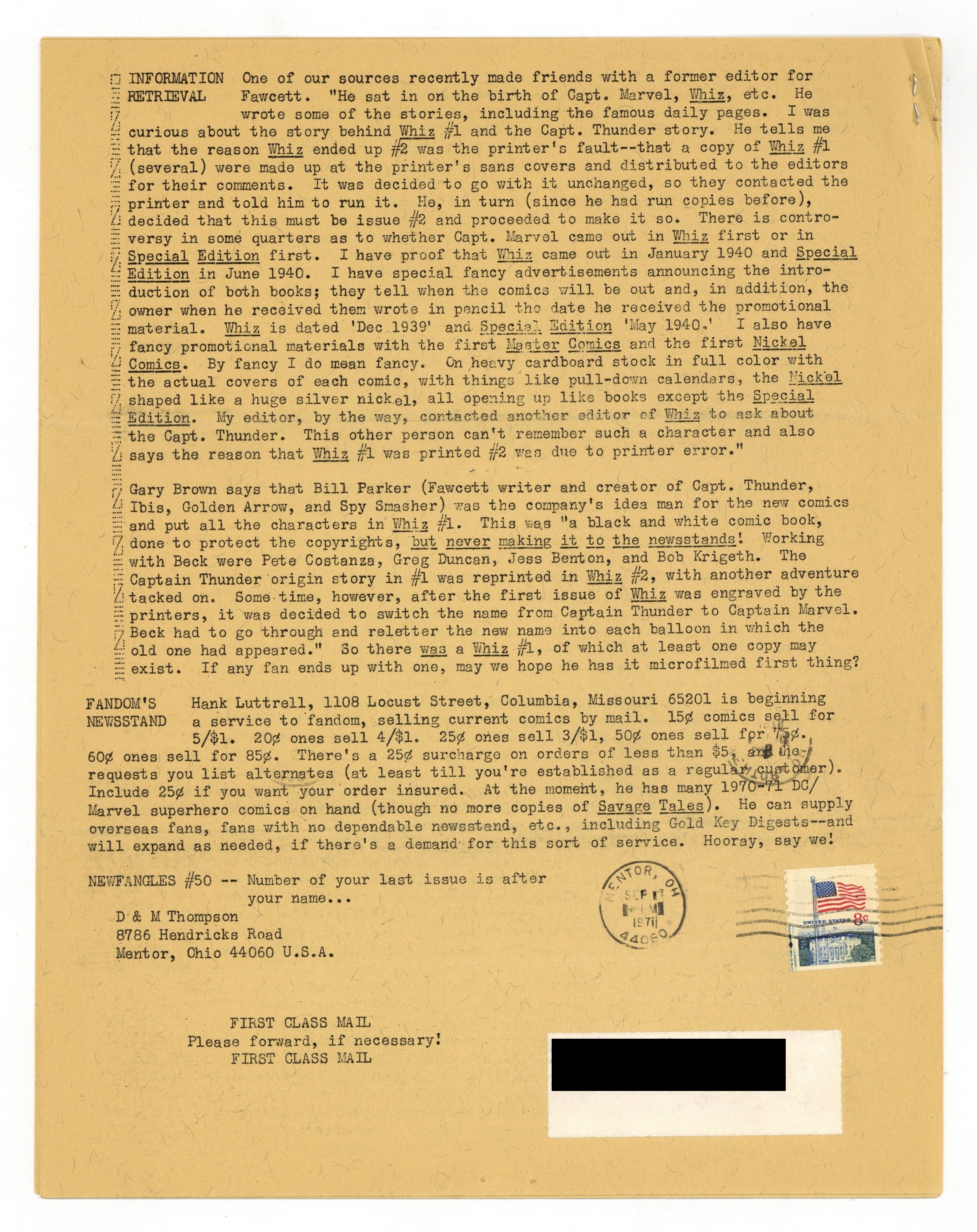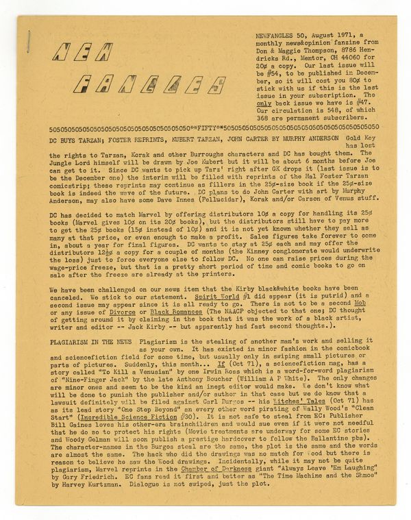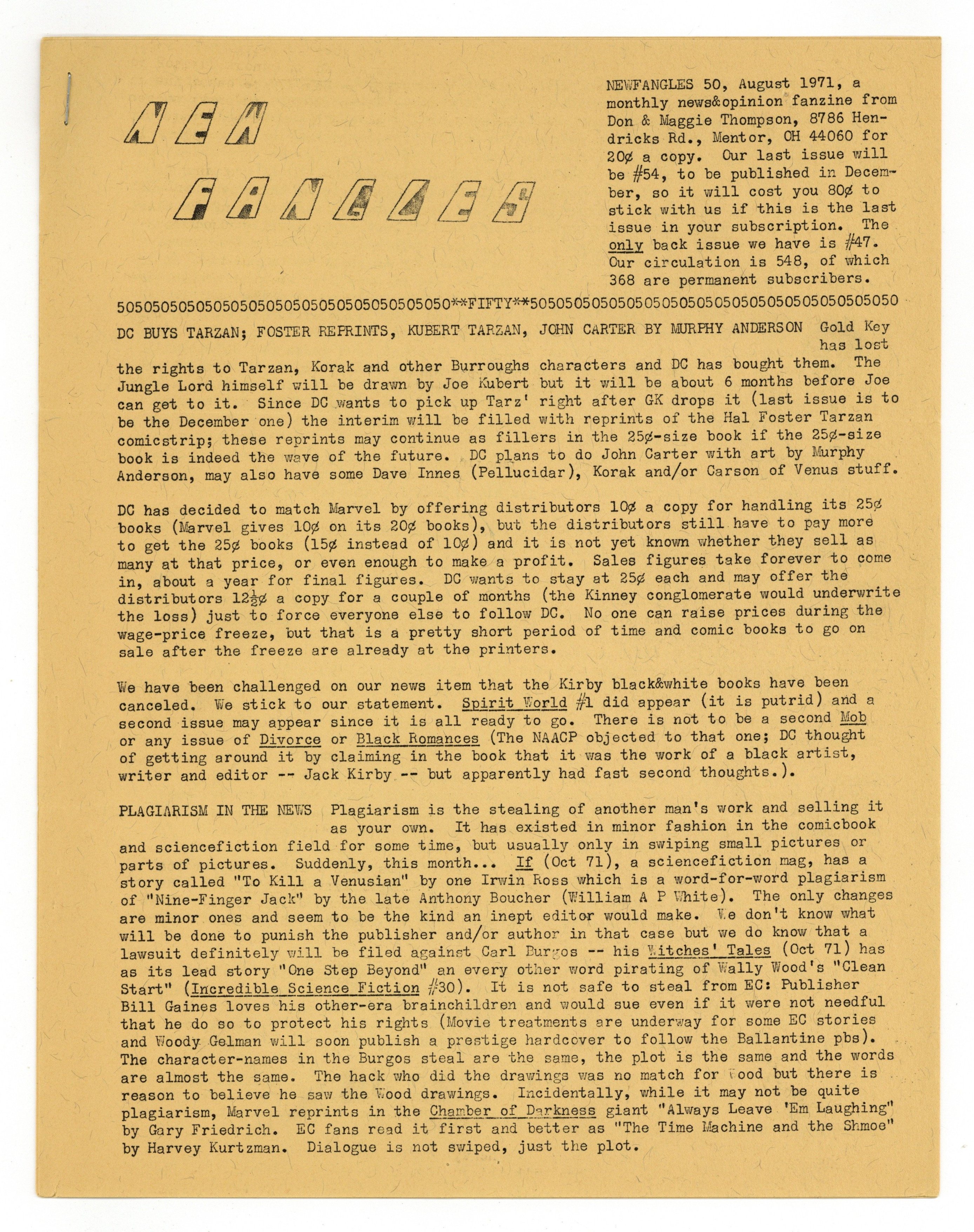 Issue 50 - August, 1971. News zine published by Don and Maggie Thompson. Newfangles is a fanzine featuring comic book news and classified ads. Loose pages stapled, 8.5" x 11", 8 pages, B&W. Cover price $0.20.