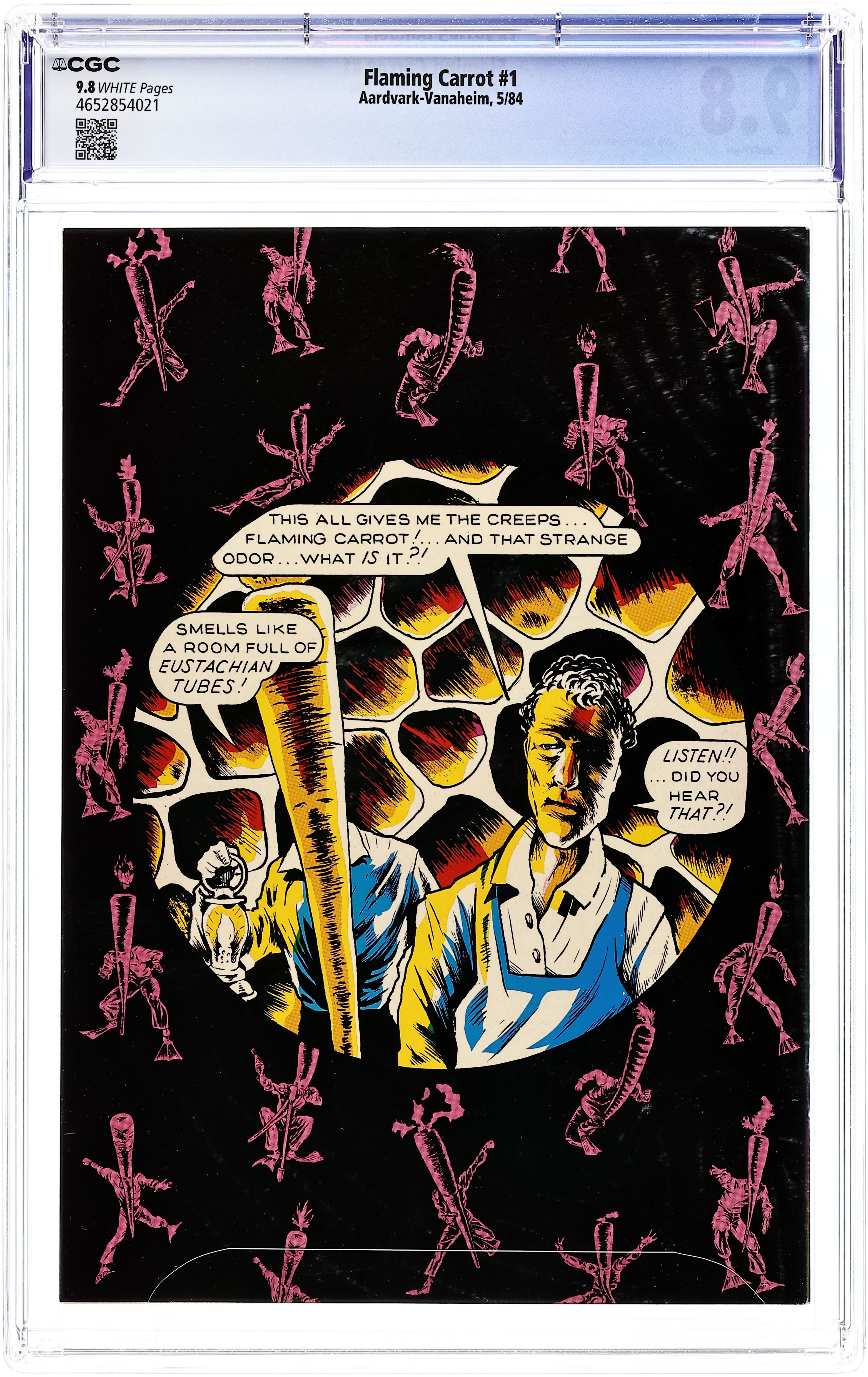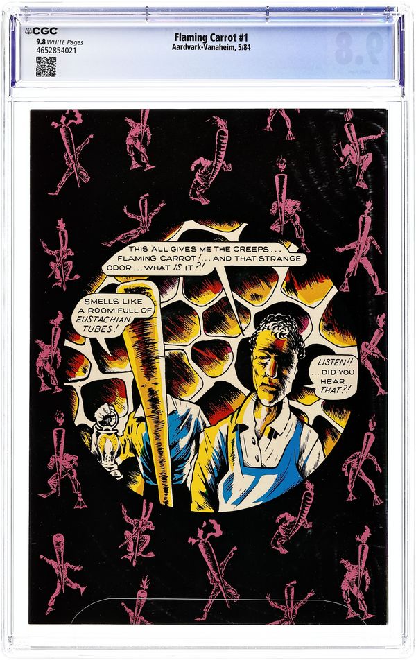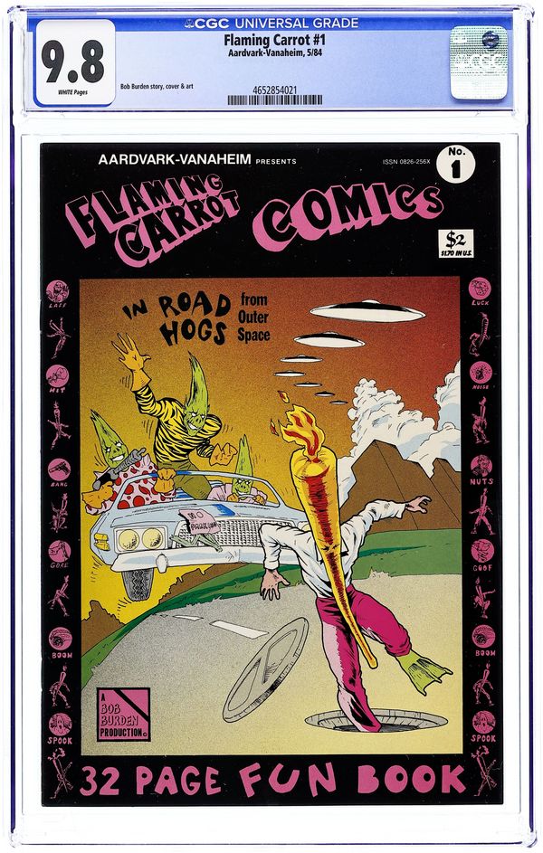 Cover art by Bob Burden. Road Hogs From Outer Space, script and art by Bob Burden; Cub reporter Radzak Zokey searches for the Flaming Carrot; Meanwhile Martians attack, insulted by all our bad SF movies. Chronicling the hilarious adventures of Bob Burden's post-Dada, neo-surrealist super-hero. 36 pgs. $1.70. Cover price $1.70.
