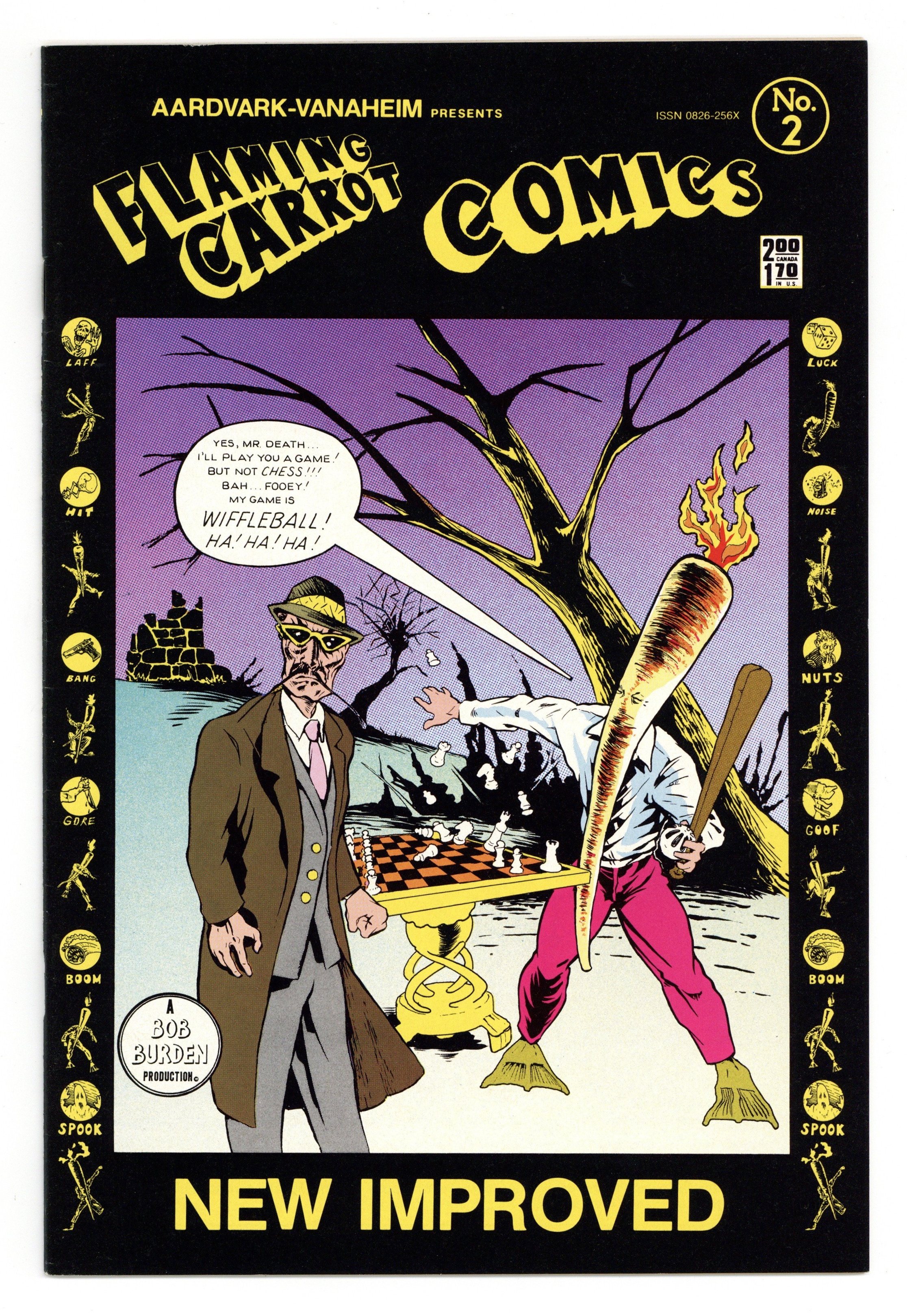 Published Jul 1984 by AV/Dark Horse.$20.00Cover art by Bob Burden. Death Gets Drunk, script and art by Bob Burden; The Carrot and Death are both chasing gang leader Mel Toupee. Chronicling the hilarious adventures of Bob Burden's post-Dada, neo-surrealist super-hero. 36 pgs. $1.70. Cover price $2.00.