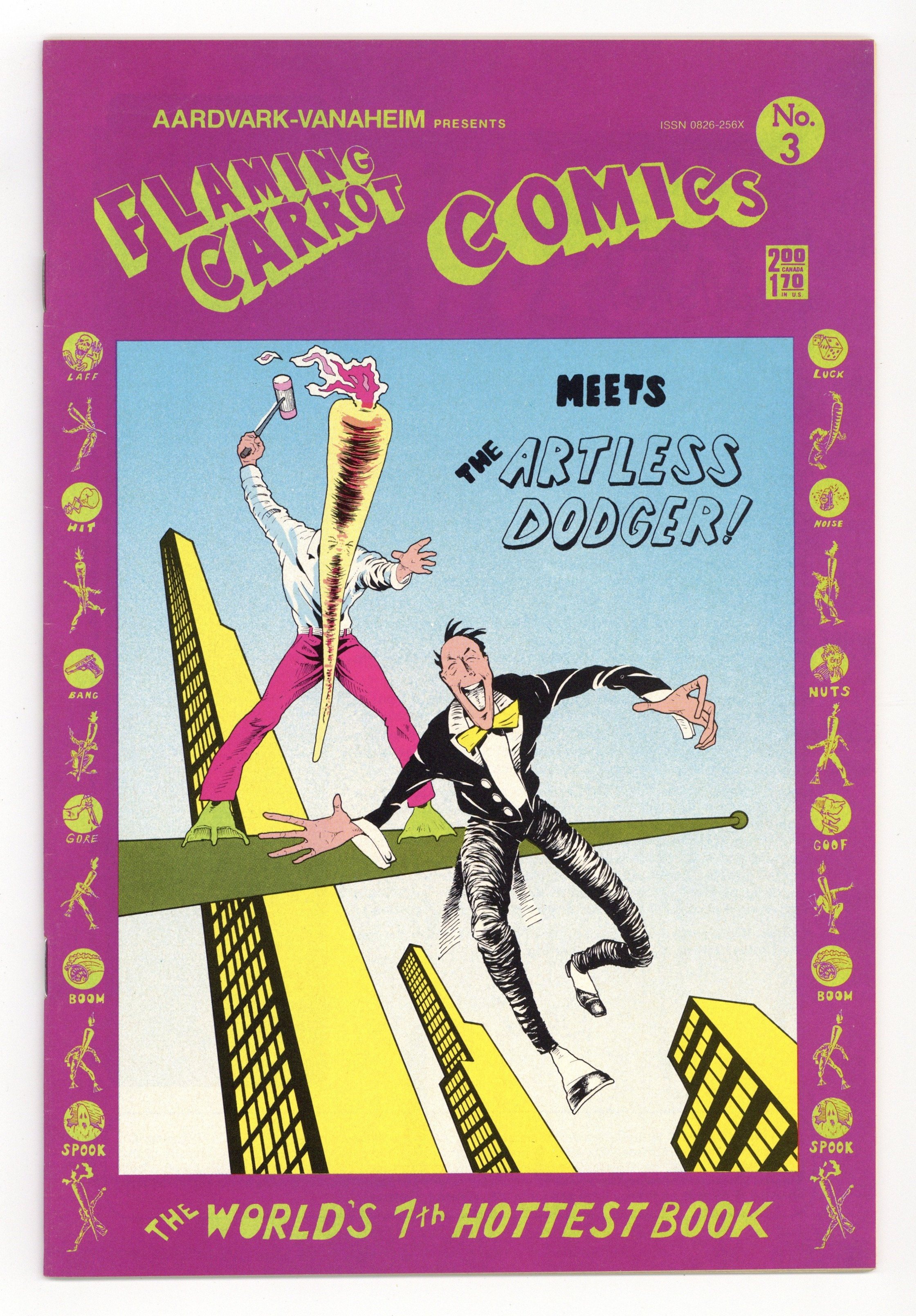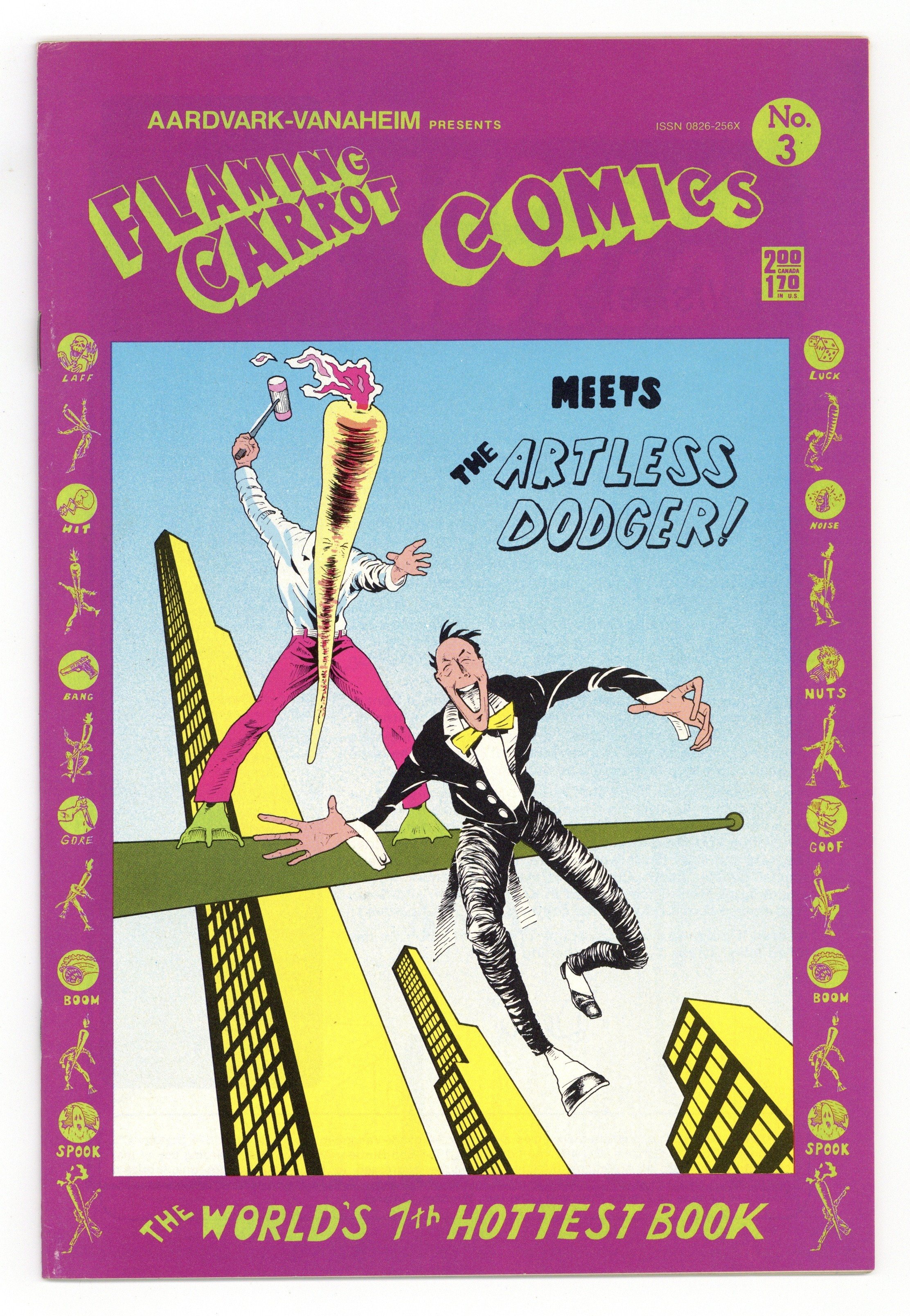 Published Sep 1984 by AV/Dark Horse.$40.00Cover art by Bob Burden. Flaming Carrot and His World, script and art by Bob Burden; origin recapped. Flaming Carrot Meets the Artless Dodger, script and art by Bob Burden; The Artless Dodger causes mass destruction and murders people to steal worthless items. Chronicling the hilarious adventures of Bob Burden's post-Dada, neo-surrealist super-hero. 36 pgs. $1.70. Cover price $2.00.