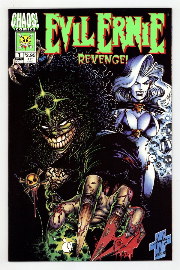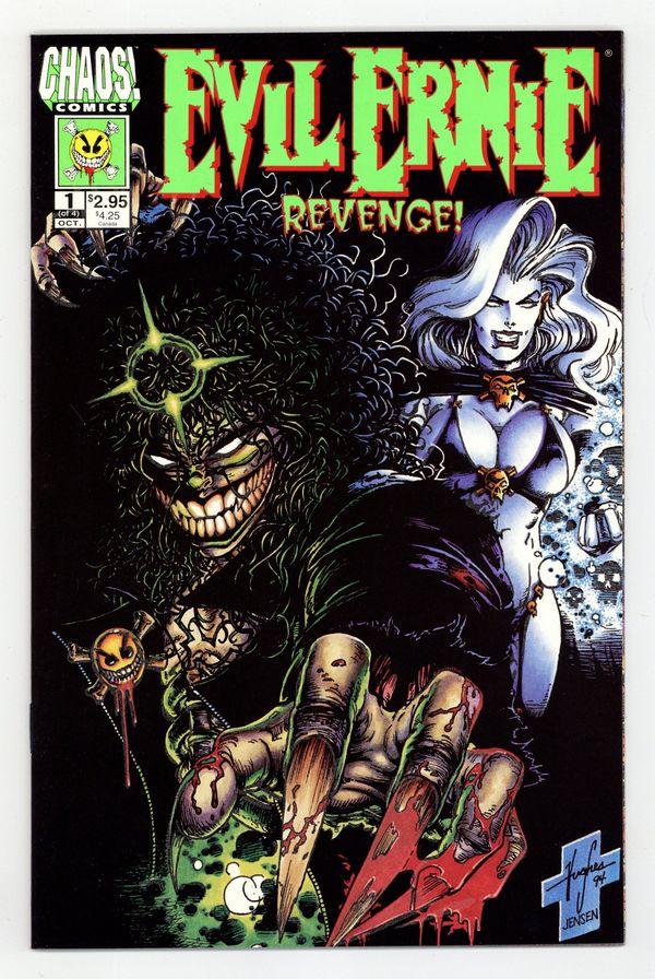 $21.00Cover glows in the dark. Cover art by Steven Hughes. "Black Yesterday For All Eternity," script by Brian Pulido, pencils by Steven Hughes, inks by Steven Hughes; Ernie thinks he has killed everyone in New York City until a living human attacks him; During their scuffle, Smiley is knocked from Ernie's lapel; Meanwhile, Price and company try to devise a plan to destroy Lady Death and nullify the source of Ernie's power; In the Endless Graveyard, Lady Death suffers from nightmares and dire premonitions. Lady Death pinup by Jim Balent. Evil Ernie illustration by Richard Legarretta. Killzone preview, script by Leonardo Jimenez (Plot) and Brian Pulido (Plot, Script), art by Leonardo Jimenez. Killzone flip book cover, pencils by Leonardo Jimenez, inks by Shawn Esposito. 40 pgs., full color. Cover price $2.95.