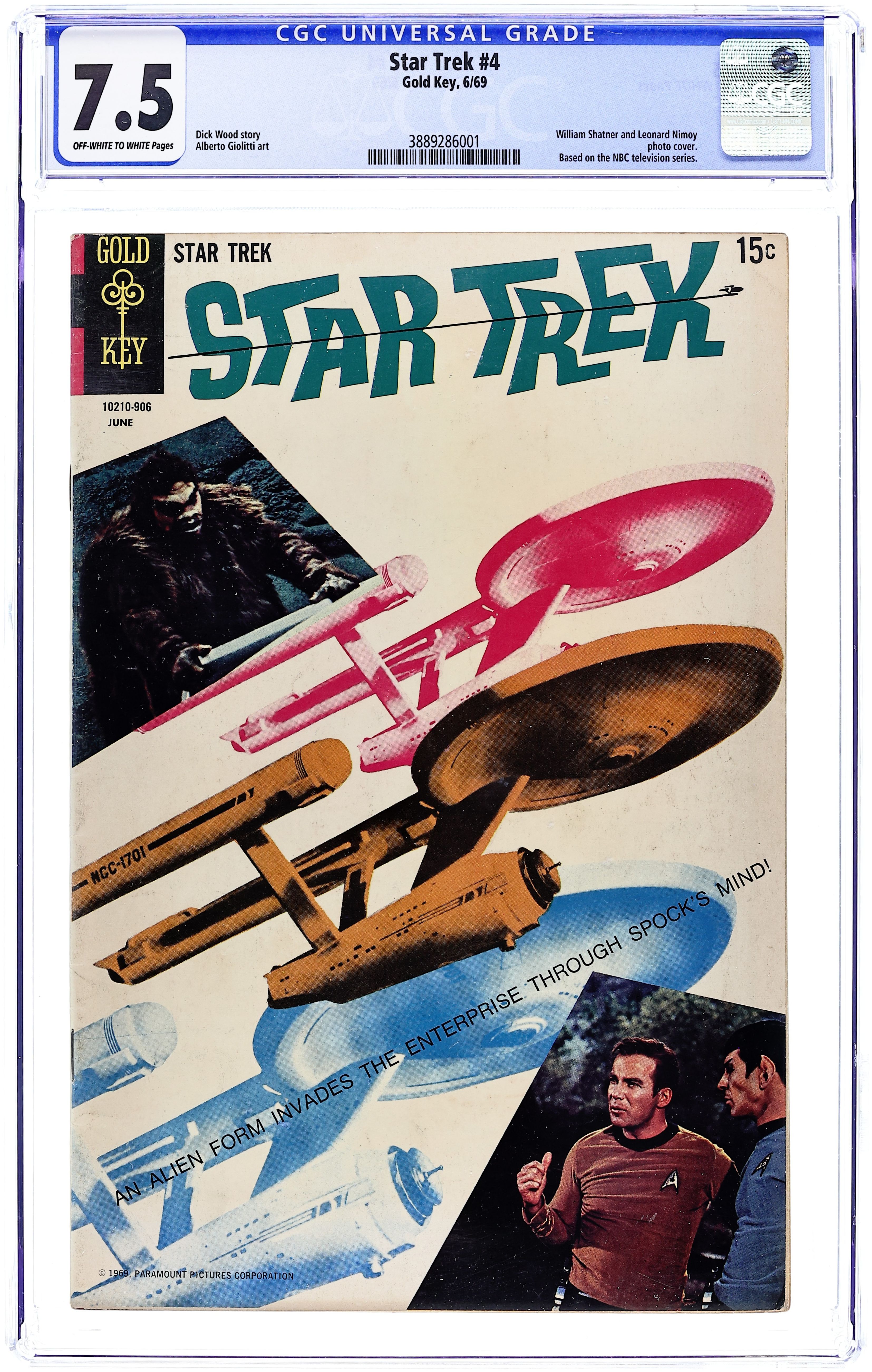 Comic book version of the original Star Trek TV series that starred William Shatner and Leonard Nimoy. 10210-906. Photo cover of William Shatner as Kirk, Leonard Nimoy as Spock, unidentified actor as an alien, and the USS Enterprise. "The Peril of Planet Quick Change, Part I: The Creatures of Light," script by Dick Wood, art by Alberto Giolitti; "The Peril of Planet Quick Change, Part II: The Sinister Guest," script by Dick Wood, art by Alberto Giolitti; A planet is continually changing its dynamic makeup; Spock is also taken over by some of the very spirits of the aliens; The whole Enterprise Crew works hard to stabilize the planet led by Spock under control of the aliens; This is kept from everyone and Spock finds later that he is unable to act independently from the alien control. Gold Key Comics Club News. 36 pgs., full color. $0.15. Cover price $0.15.