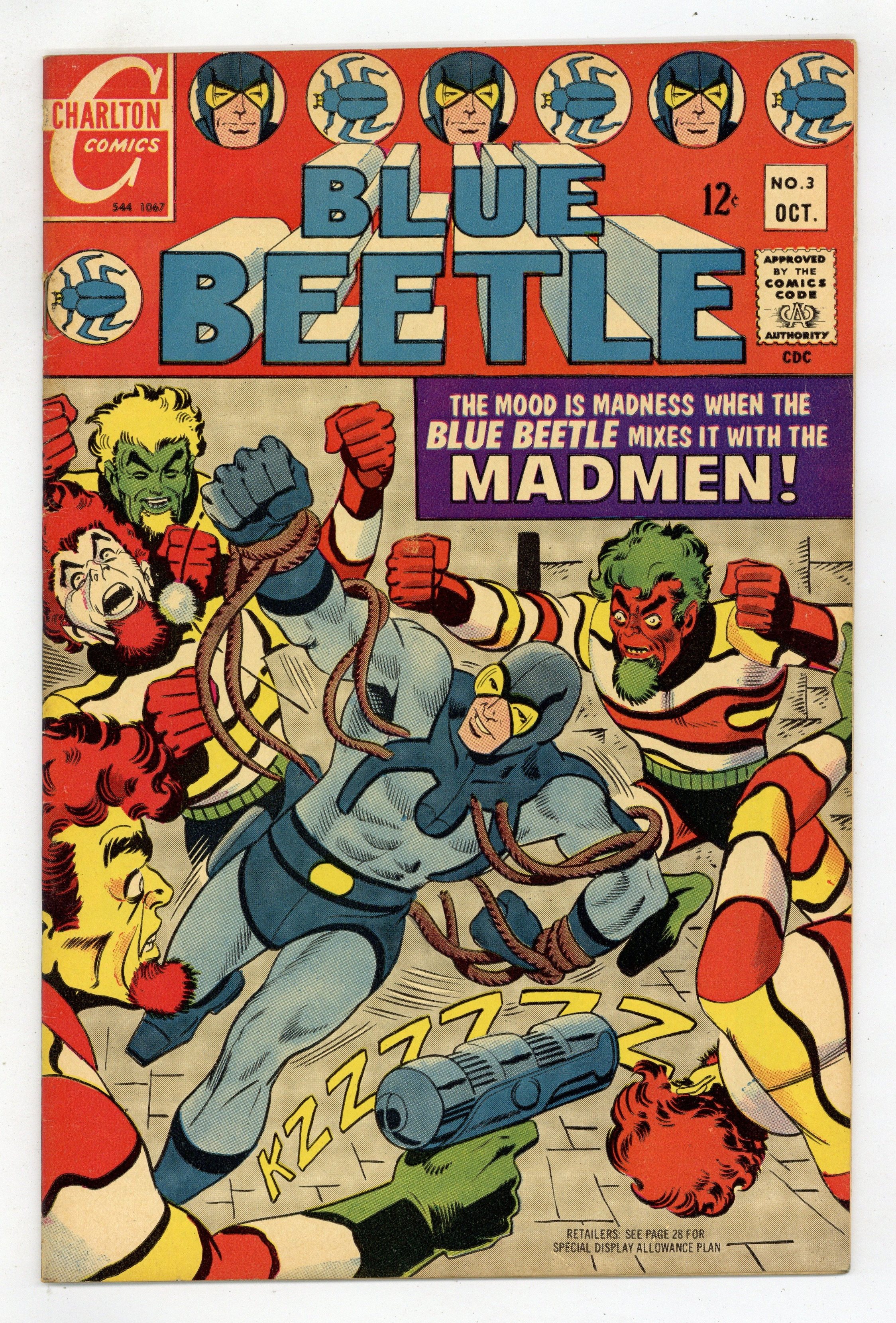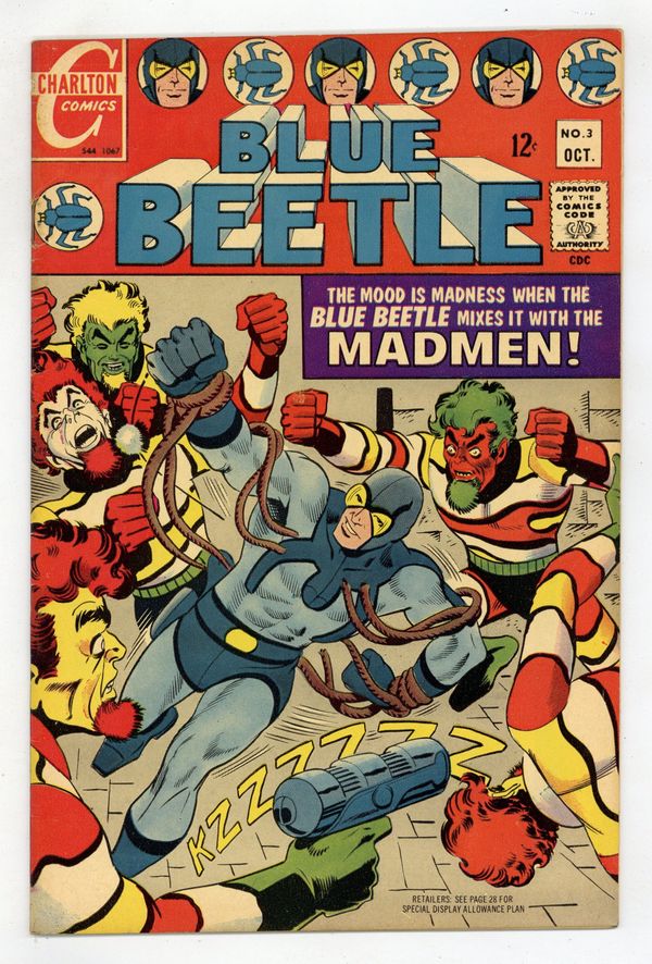 Published Oct 1967 by Charlton Comics Group.$17.00Cover by Steve Ditko. Stories and art by Steve Ditko, David Charles Glanzman and Dick Giordano. The third (or fourth, depending on how you count it) Charlton series to feature the Blue Beetle introduces the Silver Age BB, Ted Kord. The Blue Beetle battles the criminal gang known as the Madmen, whose fashion sense presages DC's The Creeper (another Ditko creation). The Question investigates a murder at a square construction. The Madmen; The Question. 32 pages, Full Color. Cover price $0.12.