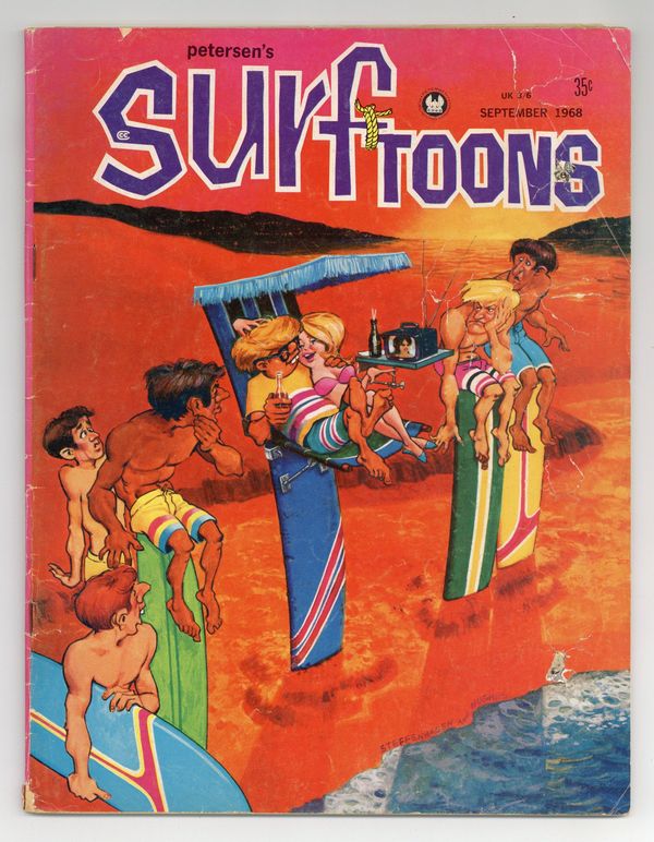 September 1968. Mad Magazine-style publication with comics, cartoons, and humor pieces about the world of surfing. Cover by Bill Hughes and Nelson Dewey. Back cover by Tom Henderson. Contributions to interior cartoons credited to Tom Henderson, Herb Cadin, Nelsen Dewey, Mike Dormer, Dennis Ellefson, Jim Grube, Tom Henderson, Bill Hughes, Jim Mueller, & Bruce Steffenhagen. 8.25-in x 10.75-in, B&W, 52 Pages. Cover price $0.35.