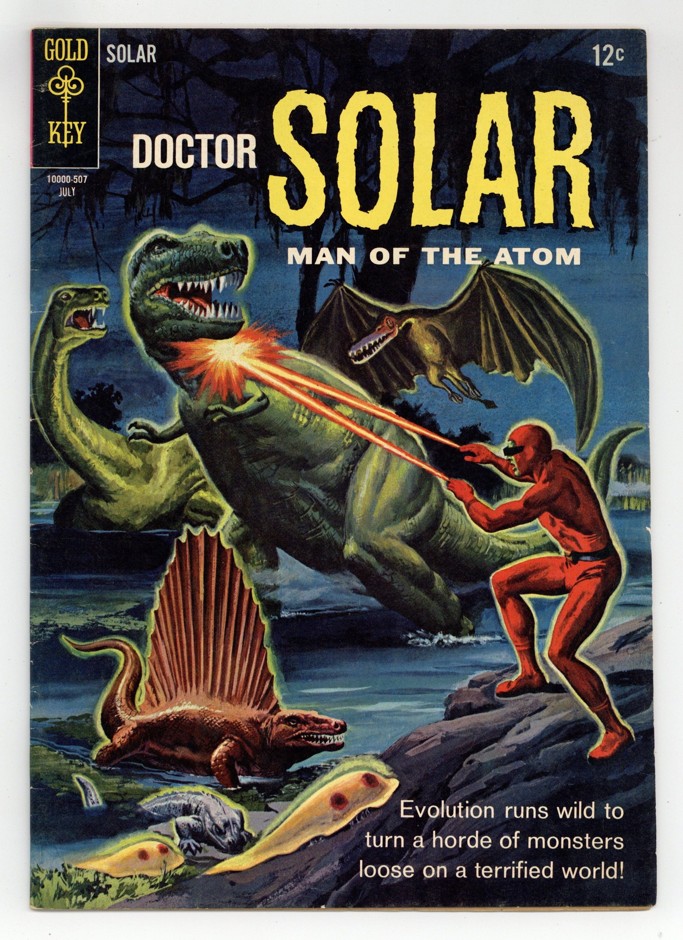 Dr. Solar in "The Meteor from 100 Million B.C.!" and Professor Harbinger in "The Raptures of Space!" Painted front and back cover (same image as front). Number on cover 10000-507 July. Cover price $0.12.