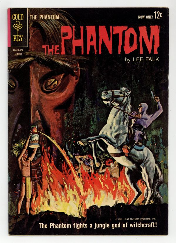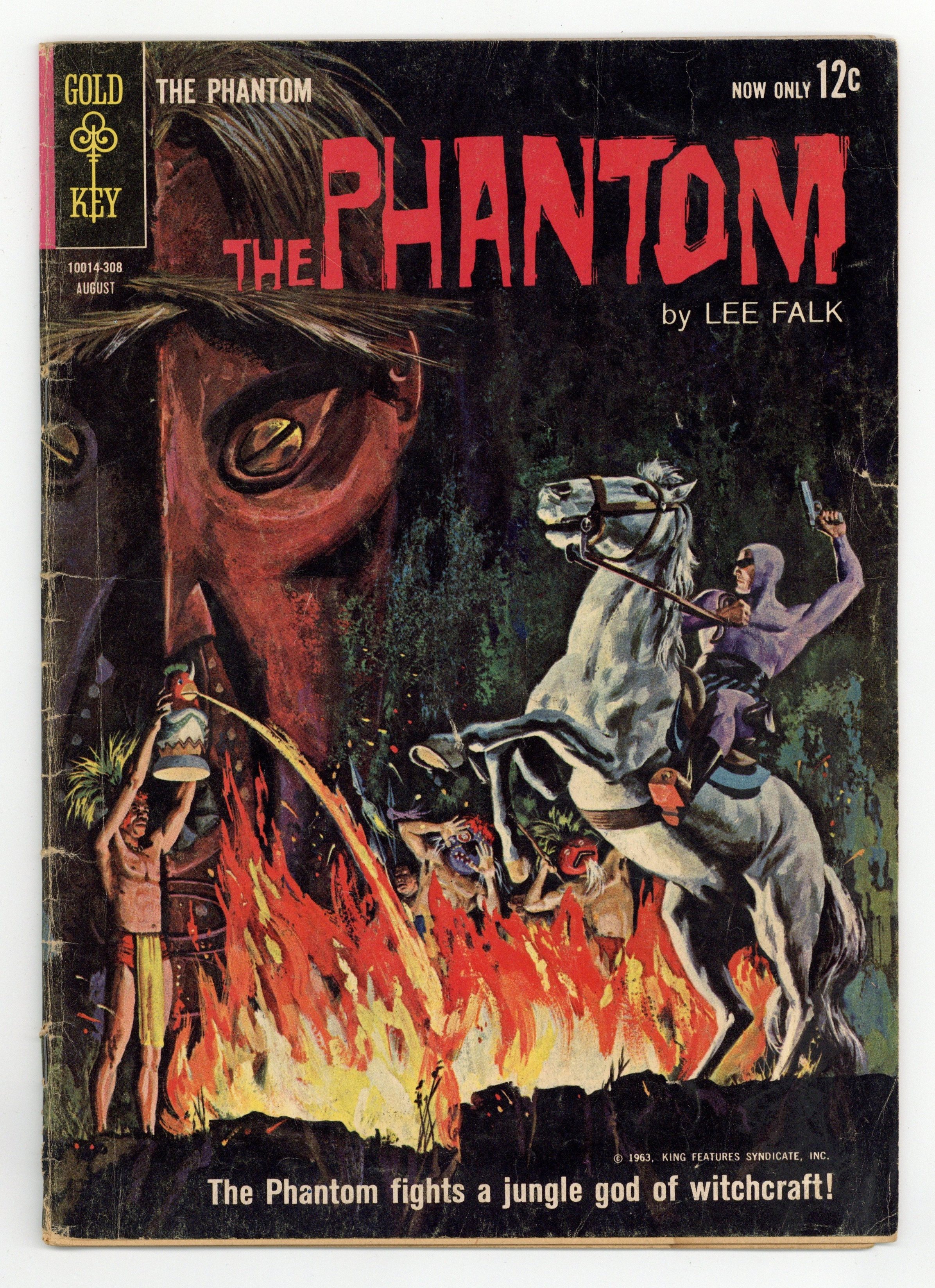 Published Aug 1963 by Gold Key/Charlton.$22.00Painted cover art by George Wilson. Physical Fitness - 4 Chest and Trunk Builder activity page. Oogooru, script by Bill Harris, art by Bill Lignante; Angry at losing power, witchmen campaign against the Phantom and against Dr. Axel's hospital; Unearthing the ancient idol Oogooru, they use tricks to attack or intimidate their enemies, then attack the hospital. Modern Voodoo article. All That Glitters, art by Bill Lignante; The three friends follow up on a treasure map for which King, "in a weak moment," paid $1000 in supplies; By diving in a jungle pool they find and finally retrieve a chest. The chest contains a taunting note from those who sold the map. The Goggle-Eye Pirates, script by Bill Harris, art by Bill Lignante; By shipping as passengers and adopting head-to-toe disguises, a pirate crew finds excellent pickings aboard cruise ships; The Phantom works out their method and disguises himself in turn as one of the pirates. Physical Fitness - 5 Exercises to Strengthen Abdomen and Trunk fact page. 36 pgs. $0.12. Cover price $0.12.