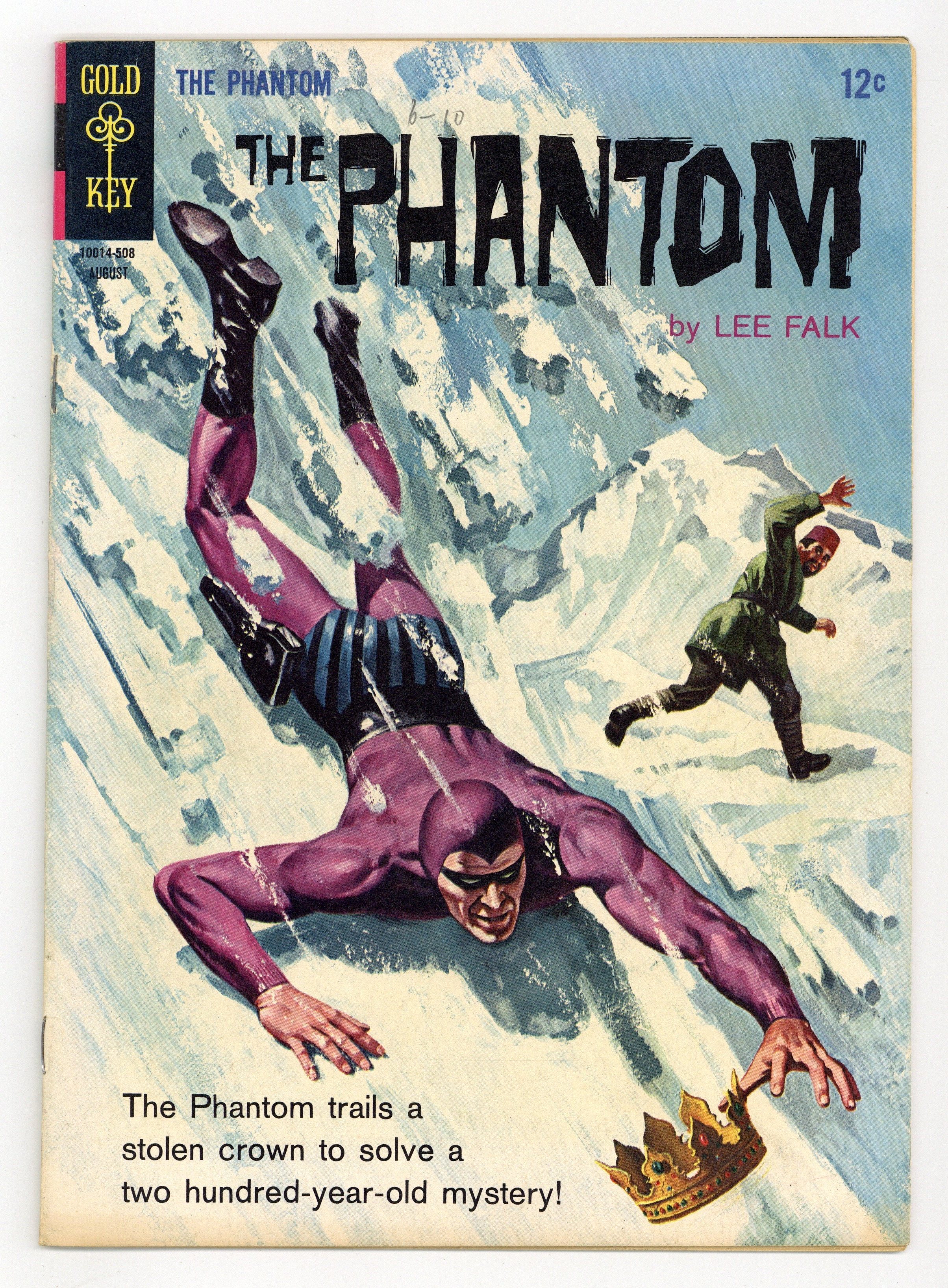 Painted cover art. "The Phantom Chronicles," script by Bill Harris, art by Bill Lignante; Rachamond tries to re-create crimes originally committed by his ancestor, including the theft of the crown of Tibet from a Himalayan lamasery; As the 13th Phantom fought Rachamond's ancestor, so the "current," 16th Phantom pursues Rachamond, who is killed in their struggle when he falls on his own knife. Cheerios ad featuring Rocky and Bullwinkle. "The Legend of the Diamond Crocodile," art by Bill Lignante; Track Hunter and Oloo investigate reports of a diamond-studded crocodile; Tracking the beast to its lair, they discover that it rolls in diamonds. Advertisement for Phantom Revell model kit on inside front cover. # on cover 10014-508 August. #13 8/65. 36 pgs., full color. Cover price $0.12.