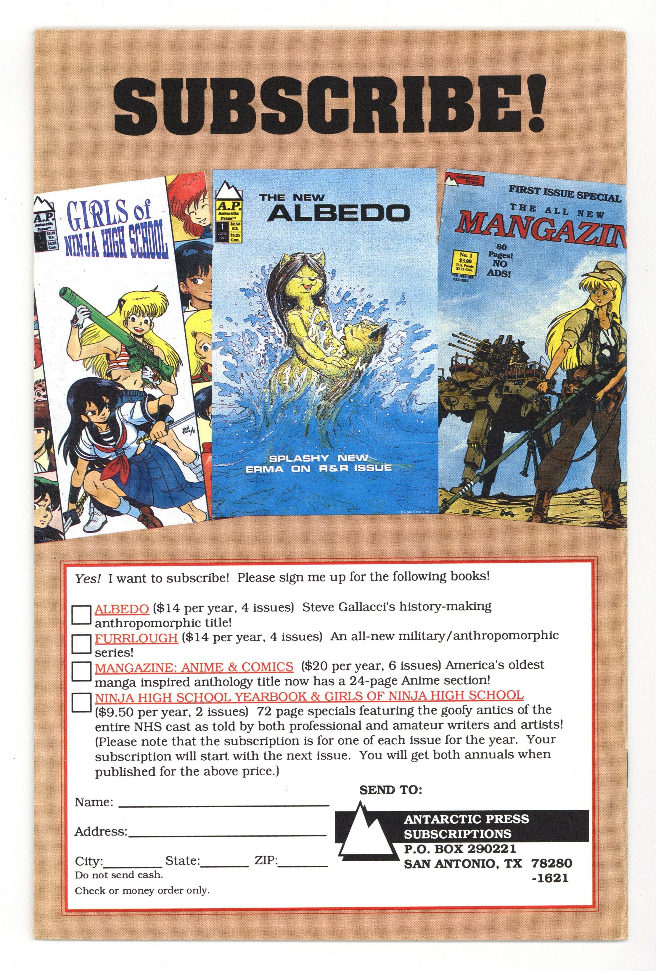 Story, art and cover by Fred Perry. Archaeologist Gina Diggers and her adopted were-cheetah sister Britanny get their first miniseries, after their popular appearances in Mangazine #11-14. Exploring El Dorado, the Lost City of Gold, Gina and Brittany find a different kind of adventure entirely when its prince falls in love with Brittany. 32 pages, B&W.