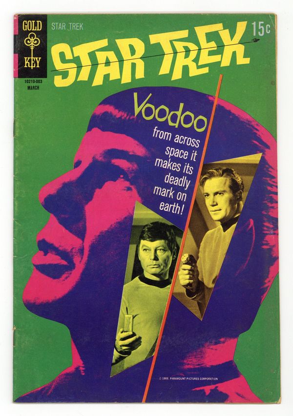 Comic book version of the original Star Trek TV series that starred William Shatner and Leonard Nimoy. Photo cover of Leonard Nimoy, DeForrest Kelly, and William Shatner. "The Voodoo Planet," script by Dick Wood, art by Alberto Giolitti; Kirk and Spock beam down to an exact replica of Earth; How did it come to be... and why? Gold Key Comics Club News. 36 pgs., full color. $0.15. Cover price $0.15.