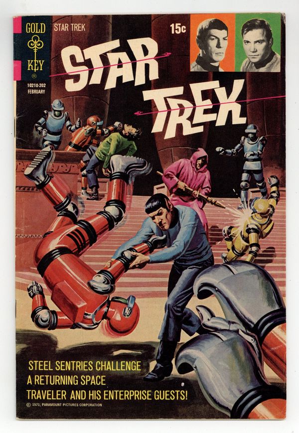Comic book version of the original Star Trek TV series that starred William Shatner and Leonard Nimoy. 10210-202. Painted cover by George Wilson, with inset photos of William Shatner as Kirk and Leonard Nimoy as Spock. "Dark Traveler," script by Len Wein, art by Alberto Giolitti; When an intergalactic nomad hitches a ride on The Enterprise, it spell trouble for Kirk and his crew...in more ways than one! 36 pgs., full color. $0.15. Cover price $0.15.