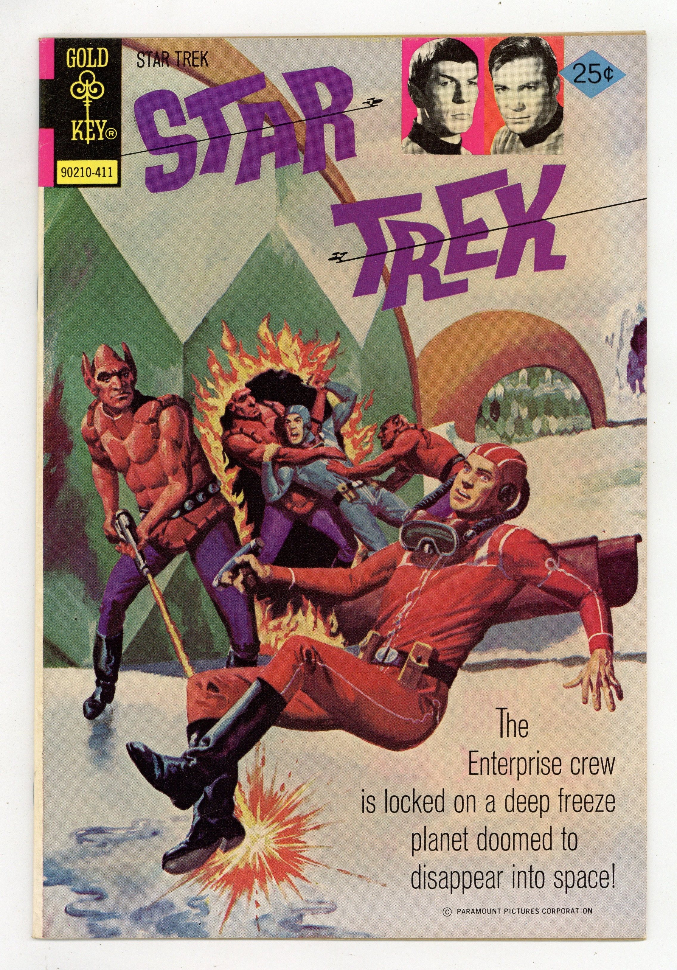 Comic book version of the original Star Trek TV series that starred William Shatner and Leonard Nimoy. 90210-411. Painted cover by George Wilson, with inset photos of William Shatner as Kirk and Leonard Nimoy as Spock. "Ice Journey," script by John David Warner, pencils by Alberto Giolitti, inks by Alden McWilliams; Kirk and Spock beam down to a planet with a perfect society... only to find that there's no such thing. 36 pgs., full color. $0.25. Cover price $0.25.