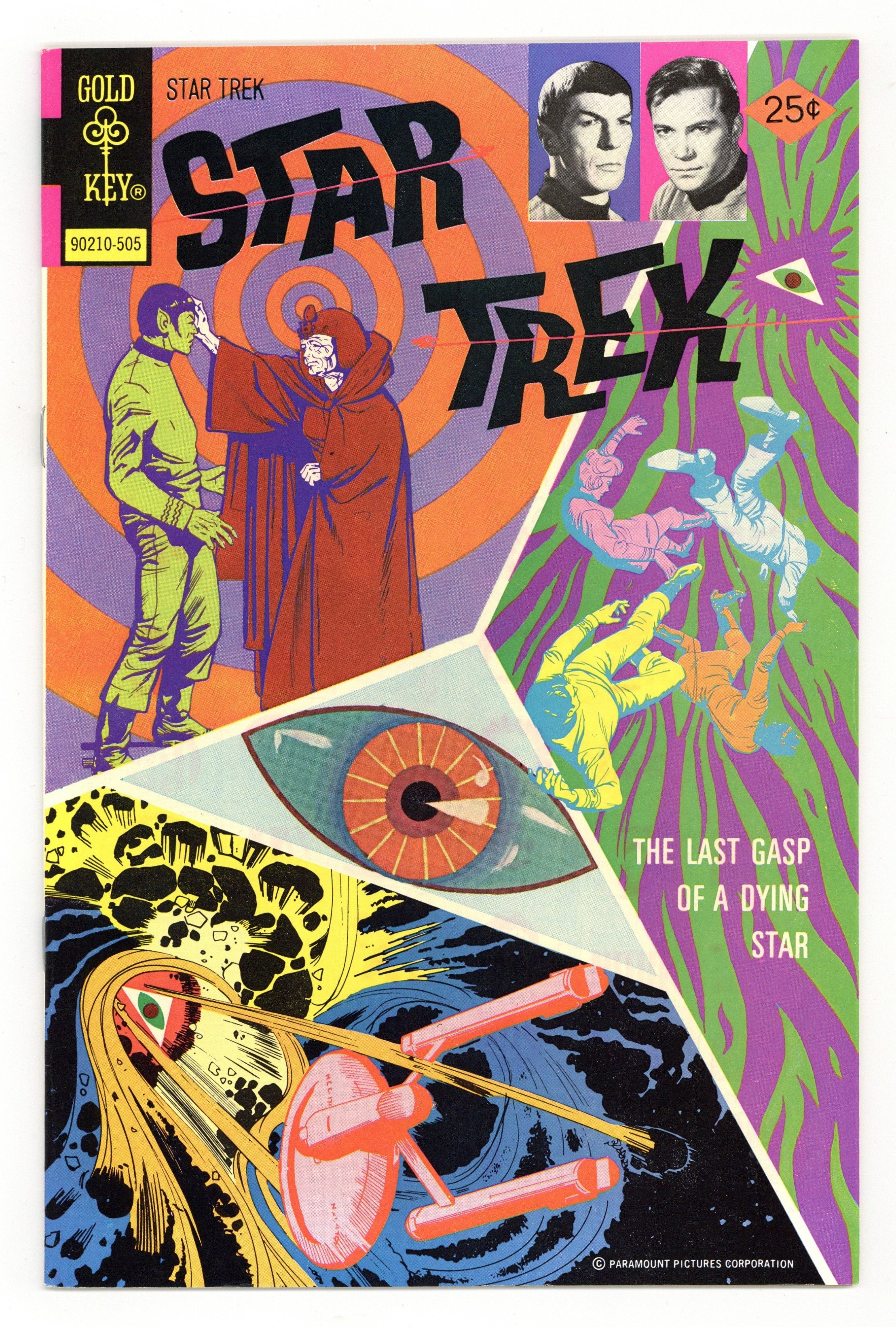 Comic book version of the original Star Trek TV series that starred William Shatner and Leonard Nimoy. 90210-505. Cover by Albert Giolitti, with inset photos of William Shatner as Kirk and Leonard Nimoy as Spock. "Death of a Star," script by Allan Moniz, art by Albert Giolitti; Kirk and Spock beam down to a planet on the brink of destruction, only to find a woman claiming to be Isis! 36 pgs., full color. $0.25. Cover price $0.25.