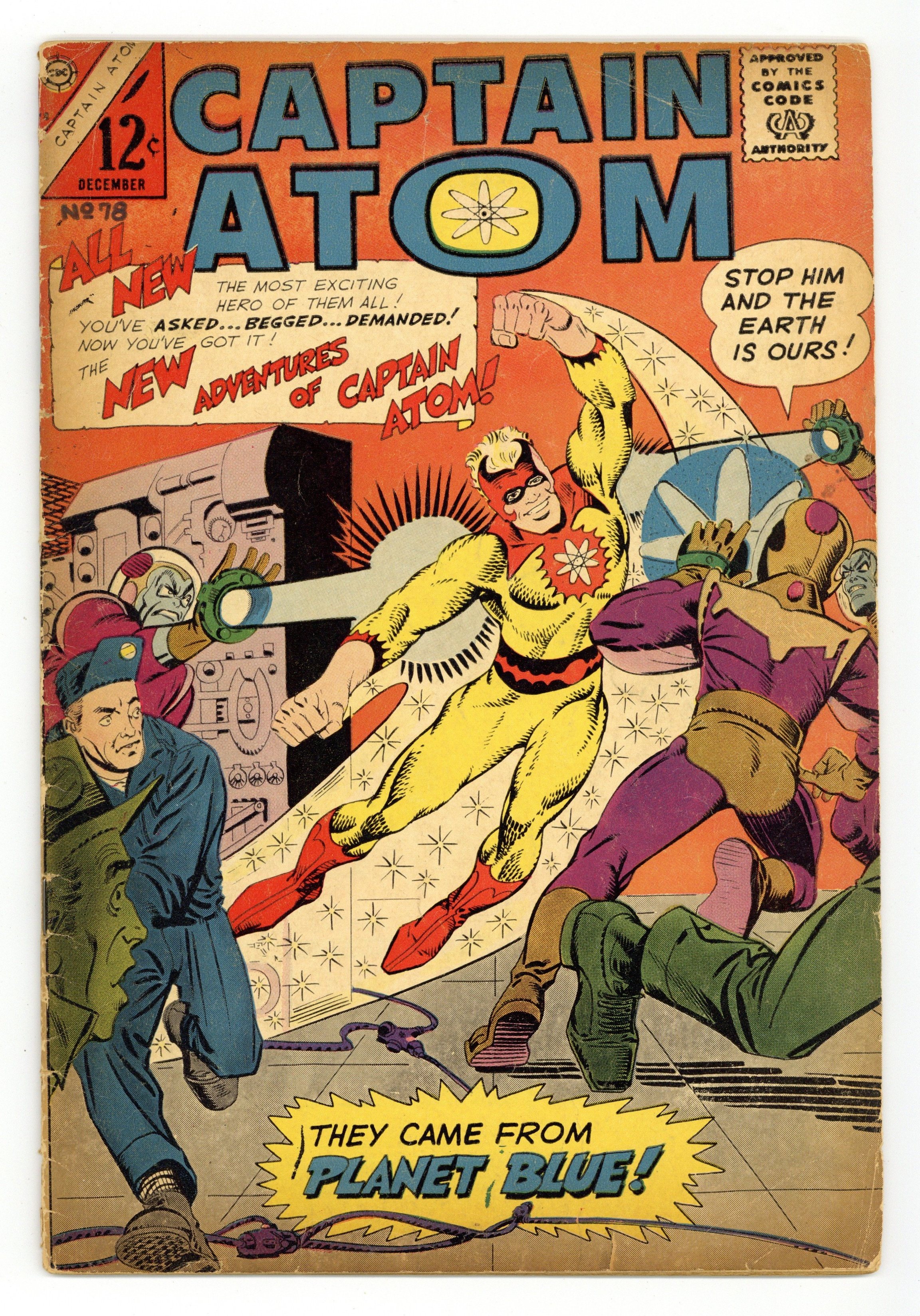 Cover art by Steve Ditko. The Gremlins From Planet Blue, script by Joe Gill, pencils by Steve Ditko, inks by Rocco "Rocke" Mastroserio; Captain Atom must rescue Professor Jupe and his daughter from aliens who have brainwashed him into working for them on killer missiles. The Sun God text story. The Vast Unknown-n-n-n, art by Ernie Bache. Previously titled Strange Suspense Stories. 36 pgs. $0.12. Cover price $0.12.