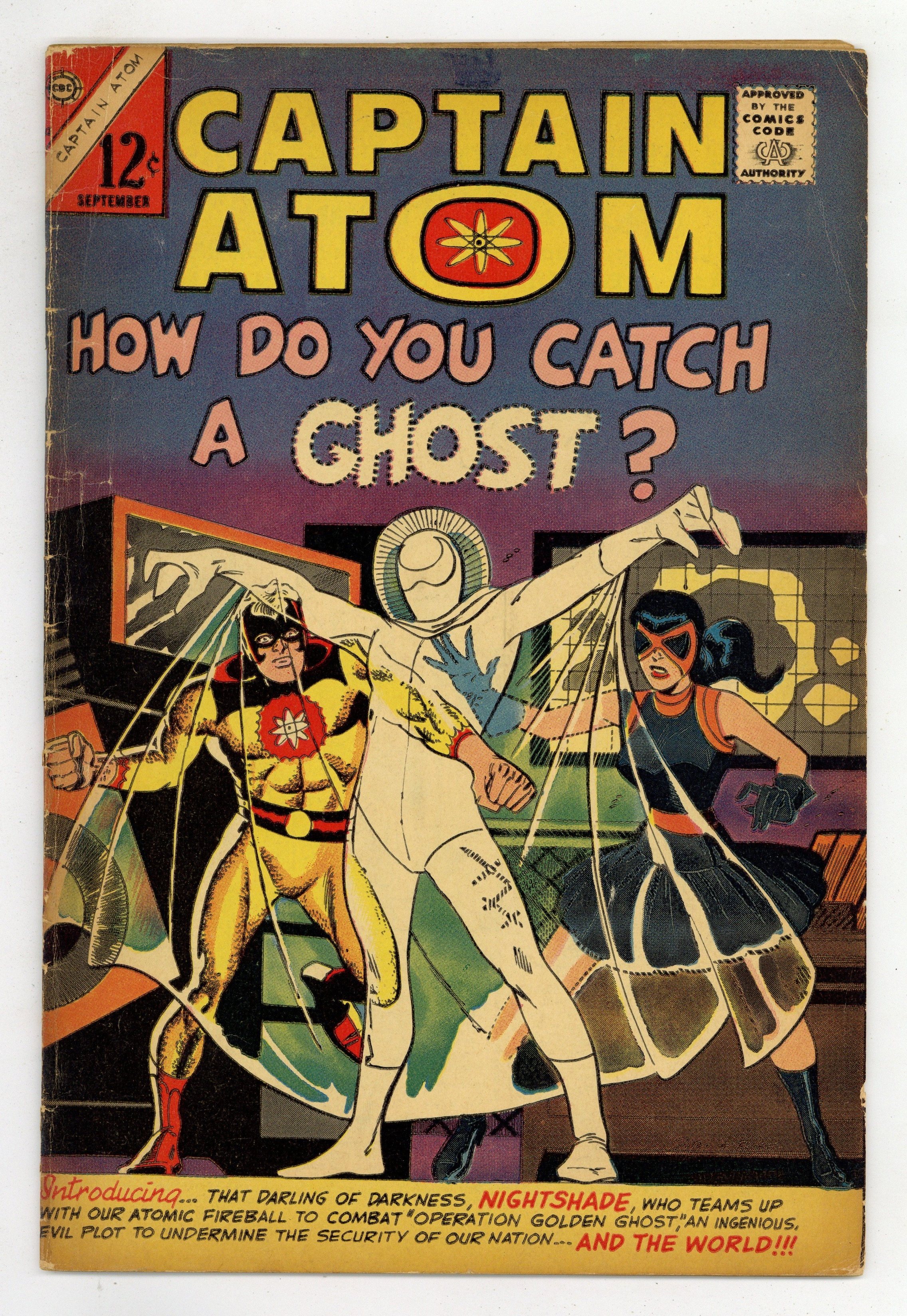 Cover pencils by Steve Ditko, inks by Rocke "Rocke" Mastroserio. Captain Atom Vs. The Ghost, script by David Kaler, pencils by Steve Ditko, inks by Rocke Mastroserio; The Ghost is planning to rob Fort Knox; The Government teams up Captain Atom and Nightshade to stop him; intro of Nightshade. Judo Master: Favorite Throws, script and art by Frank McLaughlin. 36 pgs. $0.12. Cover price $0.12.