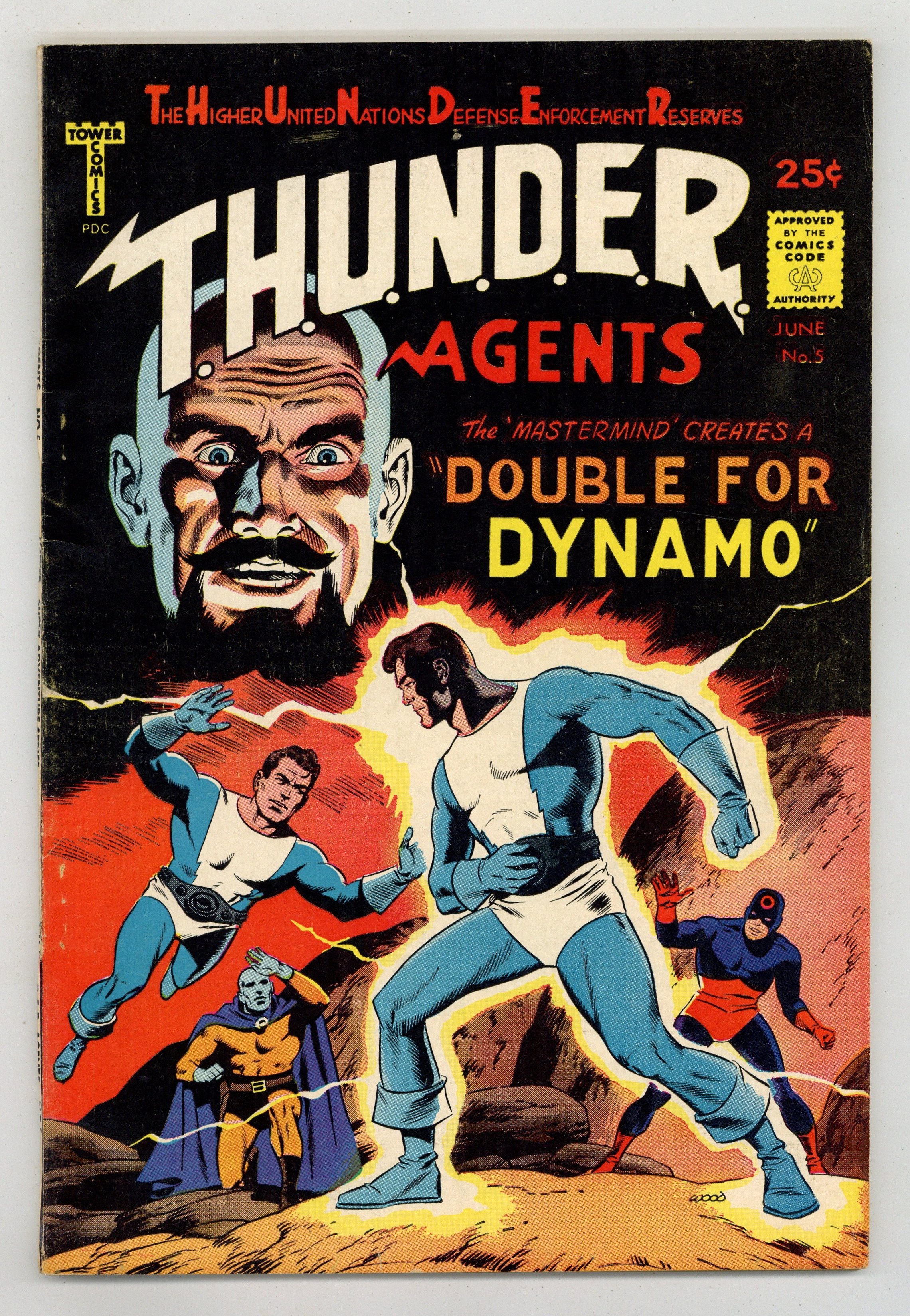 Cover by Dan Adkins and Wally Wood. Stories and art by Wally Wood, Reed Crandall, Gil Kane, Dan Adkins, Joe Coleman, Steve Skeates, John Giunta, Lou Silverstone, Frank Giacoia, Bill Pearson and Mike Sekowsky. The cult-favorite super-team saga from Tower Comics features neat powers, bizarre villains, and great art by some comics legends. The Overlord creates the android called The Golem in an effort to destroy Dynamo. The latest foe of humanity is Demo, and NoMan's multiple bodies come in handy in tracking him to his underground lair. Lightning uses super-speed to find the Commander and his daughter captured by Baron Von Kampf, but is he fast enough to save them both? The Golem; In the Caverns of Demo; Return of Baron Von Kampf; Menthor vs. Entrancer; Double for Dynamo. 64 pages, Full Color. Cover price $0.25.