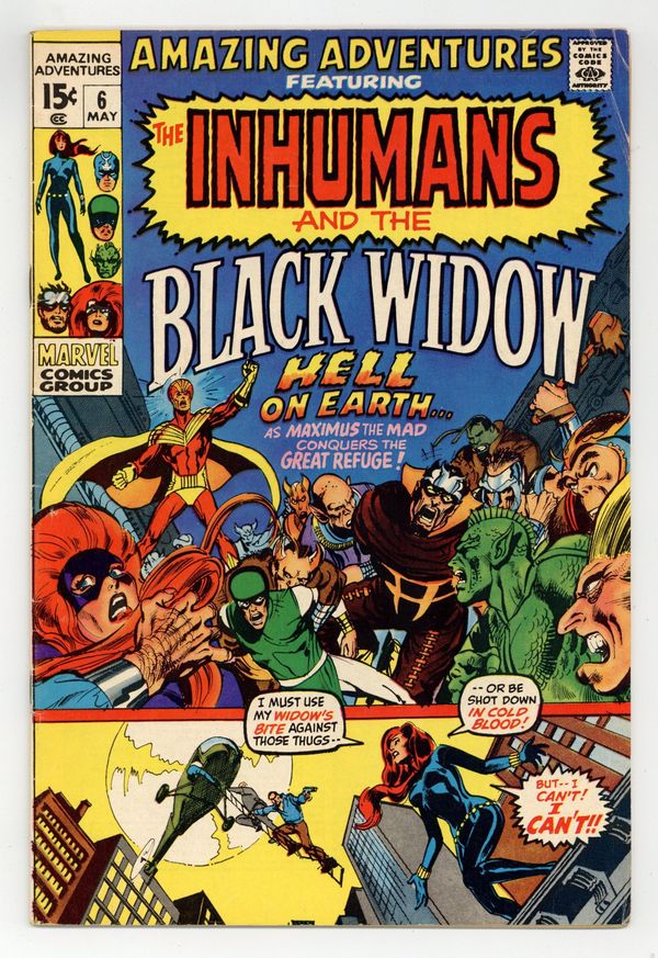 Cover by Neal Adams. "Hell On Earth!", script by Roy Thomas, pencils by Neal Adams, inks by John Verpoorten; Black Bolt moves away from the boy to a tanker that is moored at the end of the dock and hesitantly pronounces the word 'I'; The resulting shock completely destroys the tanker and creates a small tidal wave, so the boy leads Black Bolt away from the authorities while Maximus mentally enslaves the Inhumans to attack the royal family and they flee the scene. "Blood Will Tell!", script by Roy Thomas, pencils by Don Heck, inks by Sal Buscema; The Astrologer devises a plot involving dressing up his henchmen as doctors. 36 pgs, full color. $0.15. Cover price $0.15.