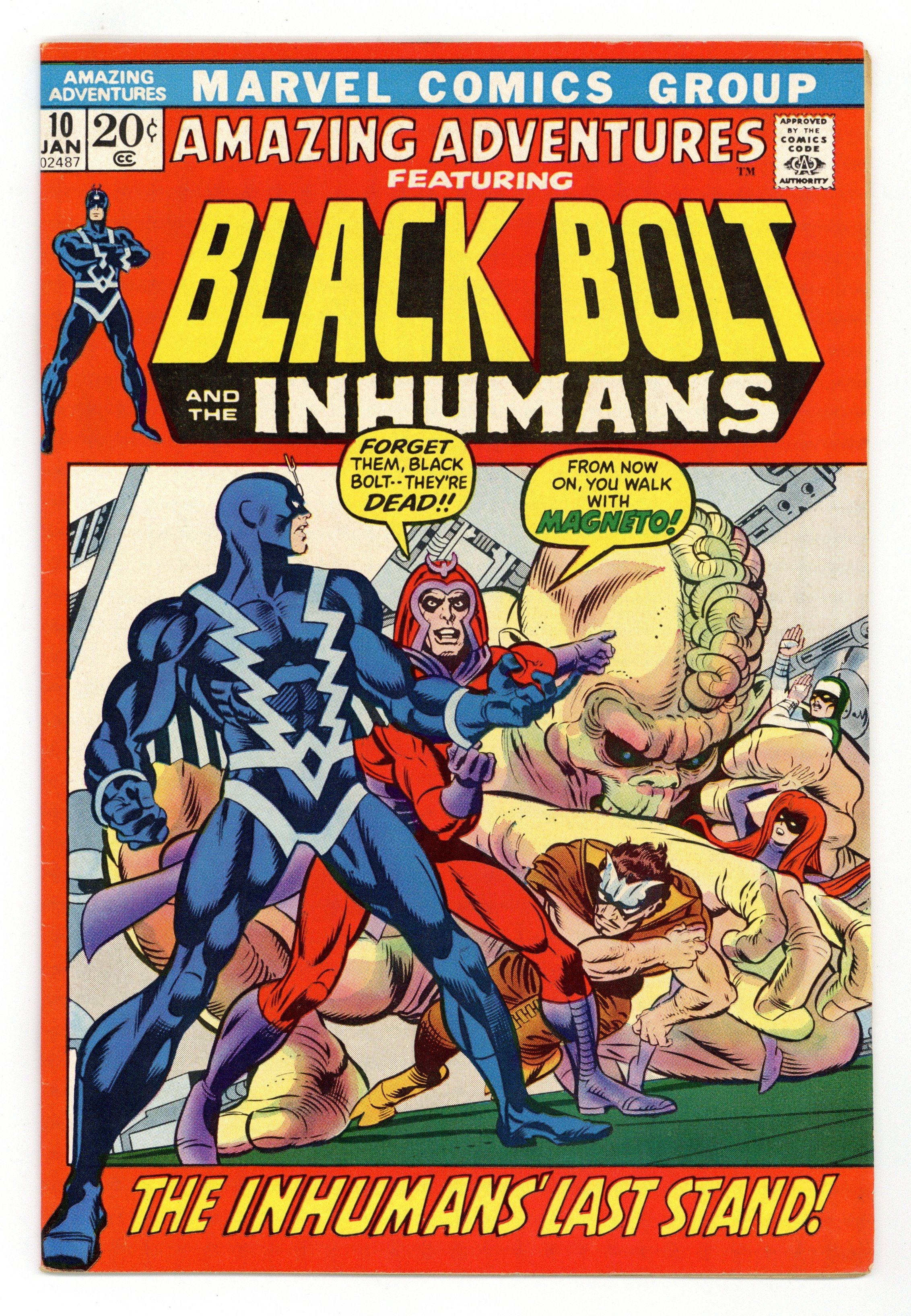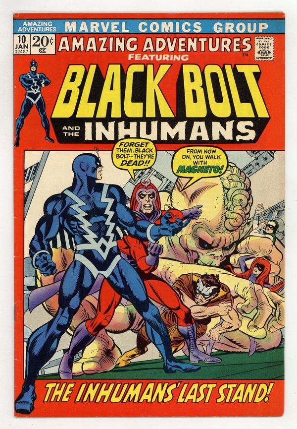 "In His Hand -- the World!" Part 2 of 2. Script by Gerry Conway. Pencils by Mike Sekowsky. Inks by Frank Giacoia. Cover by Gil Kane and Joe Sinnott. With the Inhumans as his prisoners, Magneto creates a mindless monster to force Black Bolt to obey him! Under the Master of Magnetism's control, the leader of the royal family steals a new source of cosmic energy from the federal government! Magneto plans to use the super secret energy source to power his universe machine for creating mutants! But the hypnotization of Black Bolt has had an unexpected side effect...his amnesia is gone! And now the monarch of the Inhumans remembers that he is a hero! And that spells doom for the Master of Magnetism! Second (reprint) story: "The Origin of the Incomparable Inhumans!" Script by Stan Lee. Pencils by Jack Kirby. Inks by Joe Sinnott. This story was originally published in Thor 146. (Notes: Magneto returns in Avengers 110. Black Bolt appears next in Avengers 95. This is the last issue of the series that featured the Inhumans. The Beast becomes the lead superhero in the next issue.) 32 pages Cover price $0.20.
