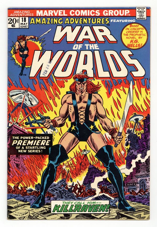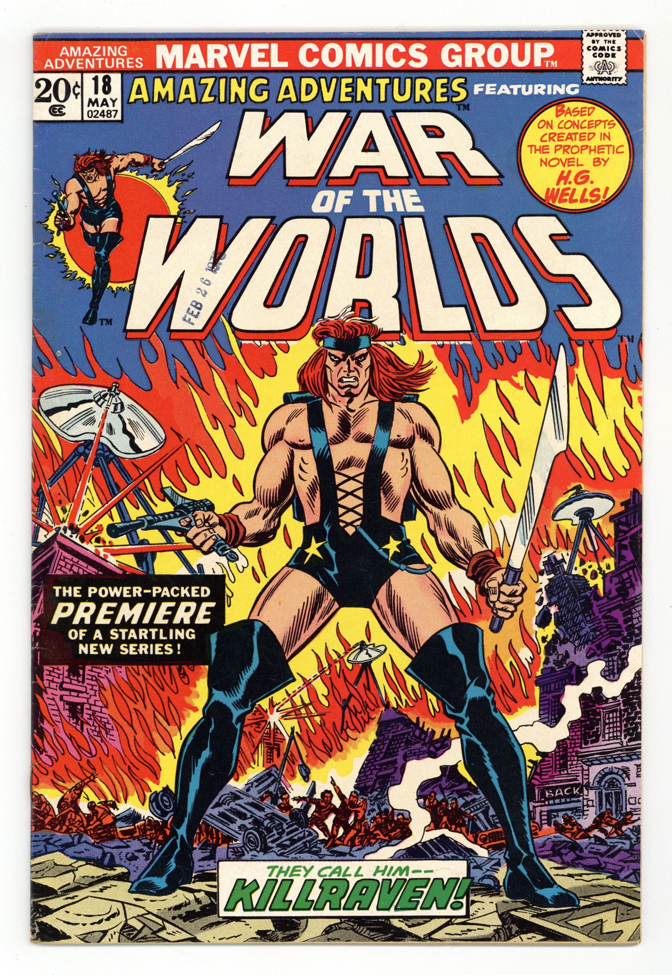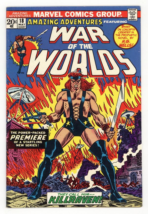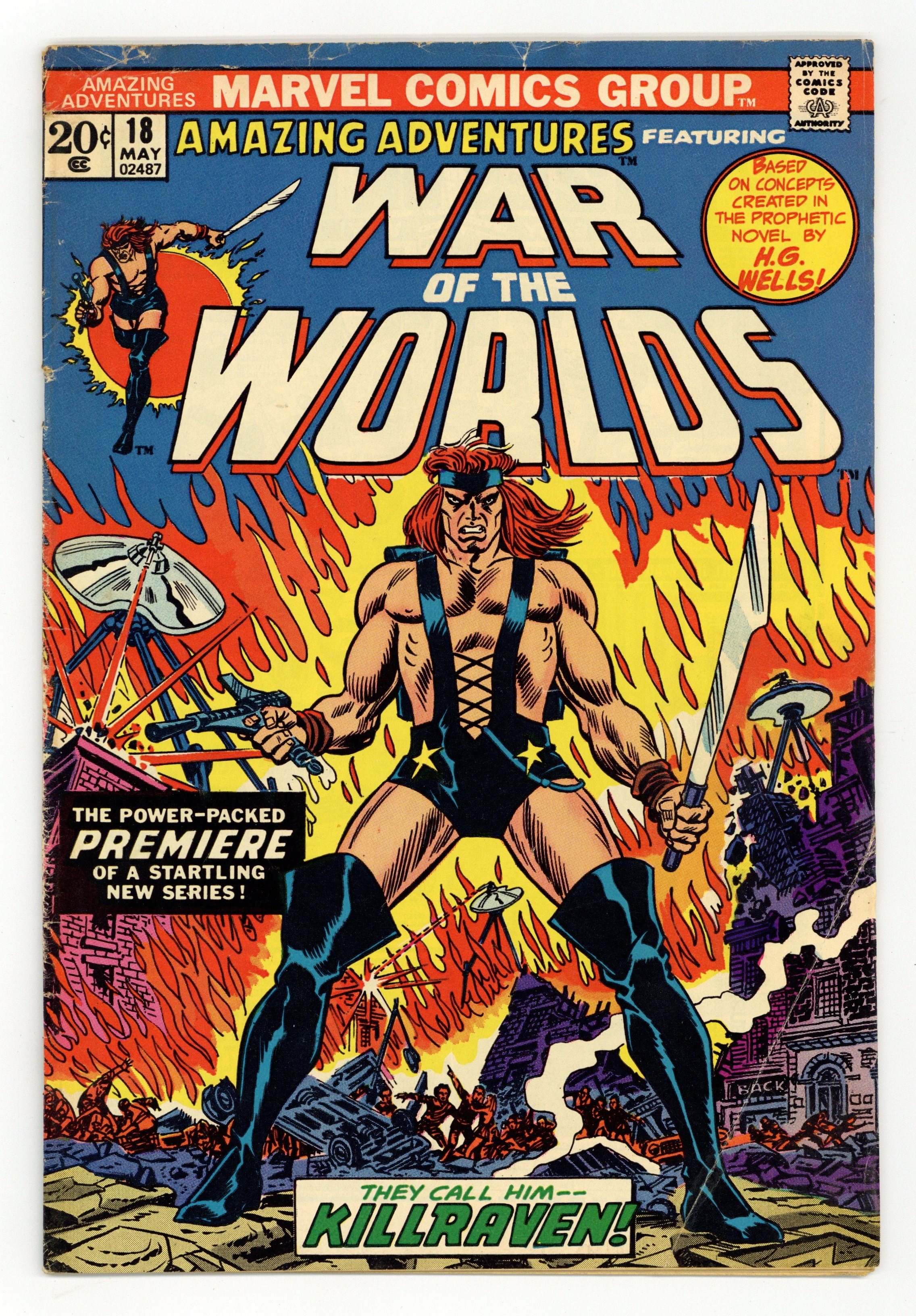 Cover by John Romita Sr. First appearance of Killraven in "The War of the Worlds!", script by Roy Thomas (Plot), Neal Adams (Plot), and Gerry Conway (Script), pencils by Neal Adams (pp 1-11) and Howard Chaykin (pp 12-20), inks by Frank Chiaramonte; New York City, 2018 AD. Killraven fights his way through a subway tunnel against a gang led by Scrapper; He enters an empty Grand Central Station to find the Keeper, who unleashes a few mutants against him; Killraven blasts a hole in the Keeper's wall, thus emptying his weapon; While the Keeper shoots at him, he throws a sharp piece of machinery and impales his enemy; Astonishingly, the man thanks him and tells him a story about 1901, when Martians invaded Earth; Inspired by the H.G. Wells novel. Article by Roy Thomas describing the creative process that led to the book. 36 pgs, full color. $0.20. Cover price $0.20.