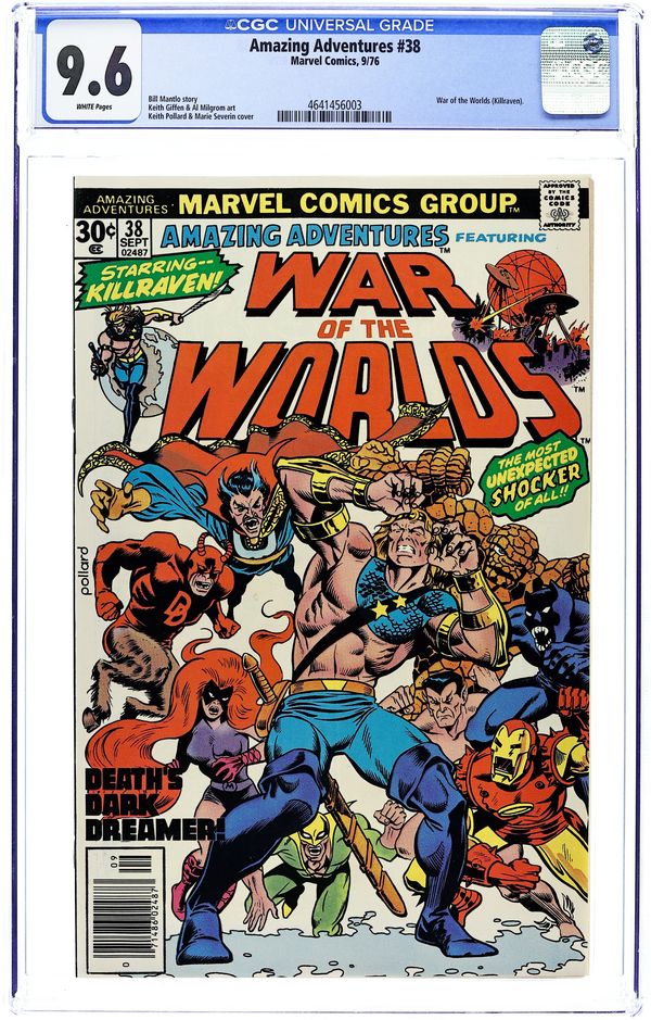 First 30-cent cover price. Cover pencils by Keith Pollard (signed) and Marie Severin (alterations), inks by Keith Pollard and Marie Severin (alterations). "Death's Dark Dreamer!", script by Keith Giffen (Co-Plot) and Bill Mantlo (Co-Plot, Script), pencils by Keith Giffen, inks by Al Milgrom; While traveling through the city of Miami on his own, Killraven is drawn into a giant dome which turns out to be the old Miami Museum of Cultural Development; He is lured there by an astronaut who, after a space mission to Mars in the year 1999, found himself bombarded with strange radiation and being put into a coma-like state; Stored in the museum, the dreaming astronaut sought to bring people to the museum in order to rouse him from his long slumber; In order to do so, he uses the building's holographic and virtual reality devices to create constructs from Earth's heroic age, and many of its now deceased heroes, and forcing Killraven to battle them; Killraven is able to battle off and defeat the collection of heroes which have been perverted into almost demonic-looking beings. Brief appearances by Iron Man, Man-Thing, Doctor Strange, the Fantastic Four, the Avengers, and Daredevil. 36 pgs, full color. $0.25. Cover price $0.30.