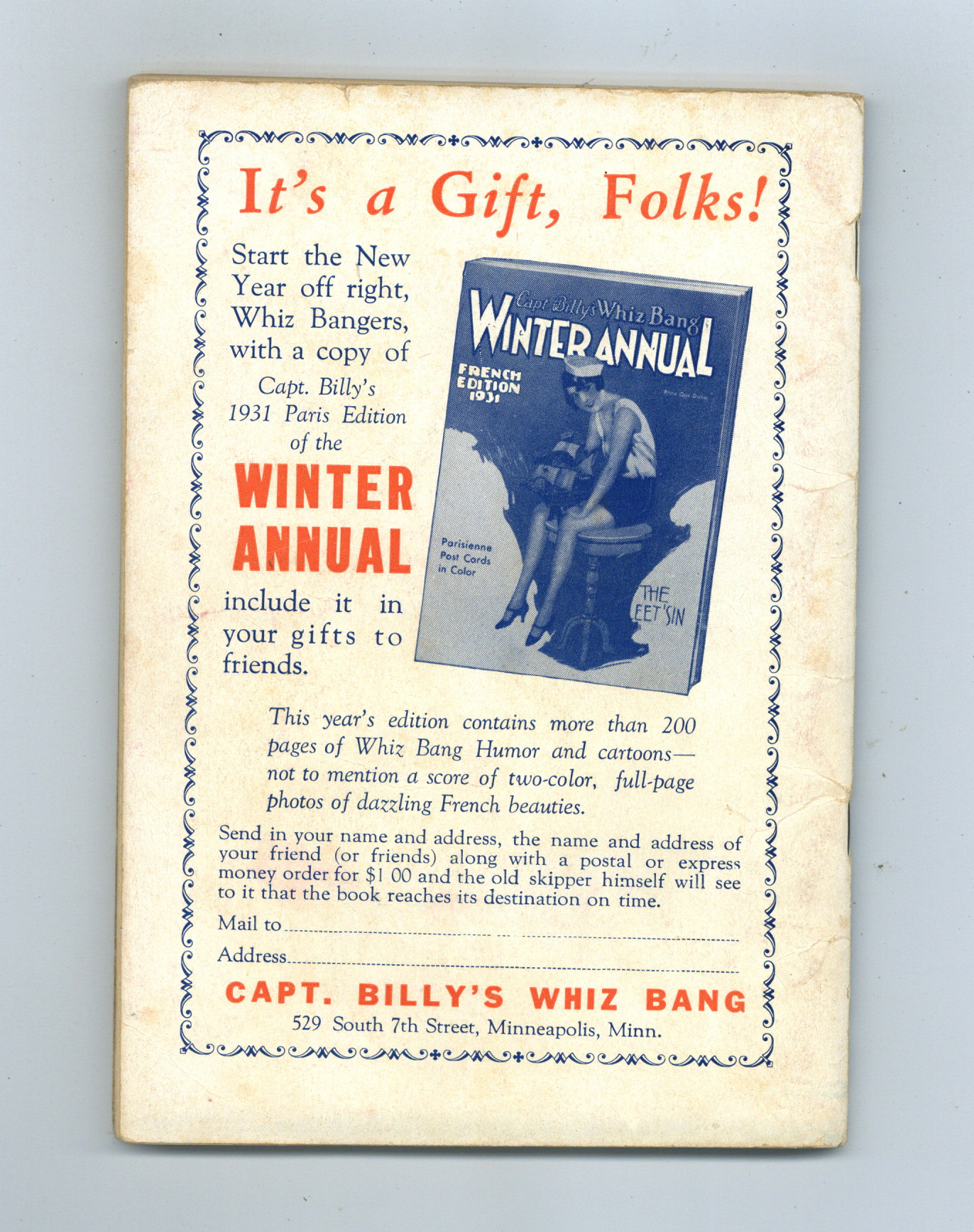 $100.00Captain Billy's Whiz Bang was one of the most popular and notorious humor magazines of the 1920s. Contains jokes and humorous stories. 5" x 7.5", 66 pages, B&W. Cover price $0.25.