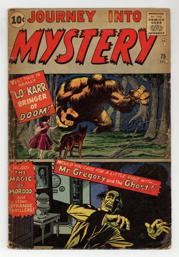 Last 10-cent cover price. Cover pencils by Jack Kirby, inks by Dick Ayers. "Lo-Karr, Bringer of Doom!," pencils by Jack Kirby, inks by Dick Ayers; As international tensions mount, an alien lands and demonstrates its power before leaving, promising to return with an army. "Mr. Gregory and the Ghost!," pencils by Jack Kirby, inks by George Klein; A homebuilder who uses shoddy materials and unskilled labor gets his comeuppance when he builds a home for himself out of the wood from haunted trees. "The Magic of Mordoo!," art by Paul Reinman; A man falls in love with a middle-aged woman on vacation, but wants a younger wife; He convinces her to let a gypsy magician make her young again. "The Man Who Lost the World!," script by Stan Lee, art by Steve Ditko; A scientist's assistant is determined to find if his time machine that sends objects into the past or future. Ad for Amazing Adult Fantasy. 36 pgs., full color. $0.10. Cover price $0.10.