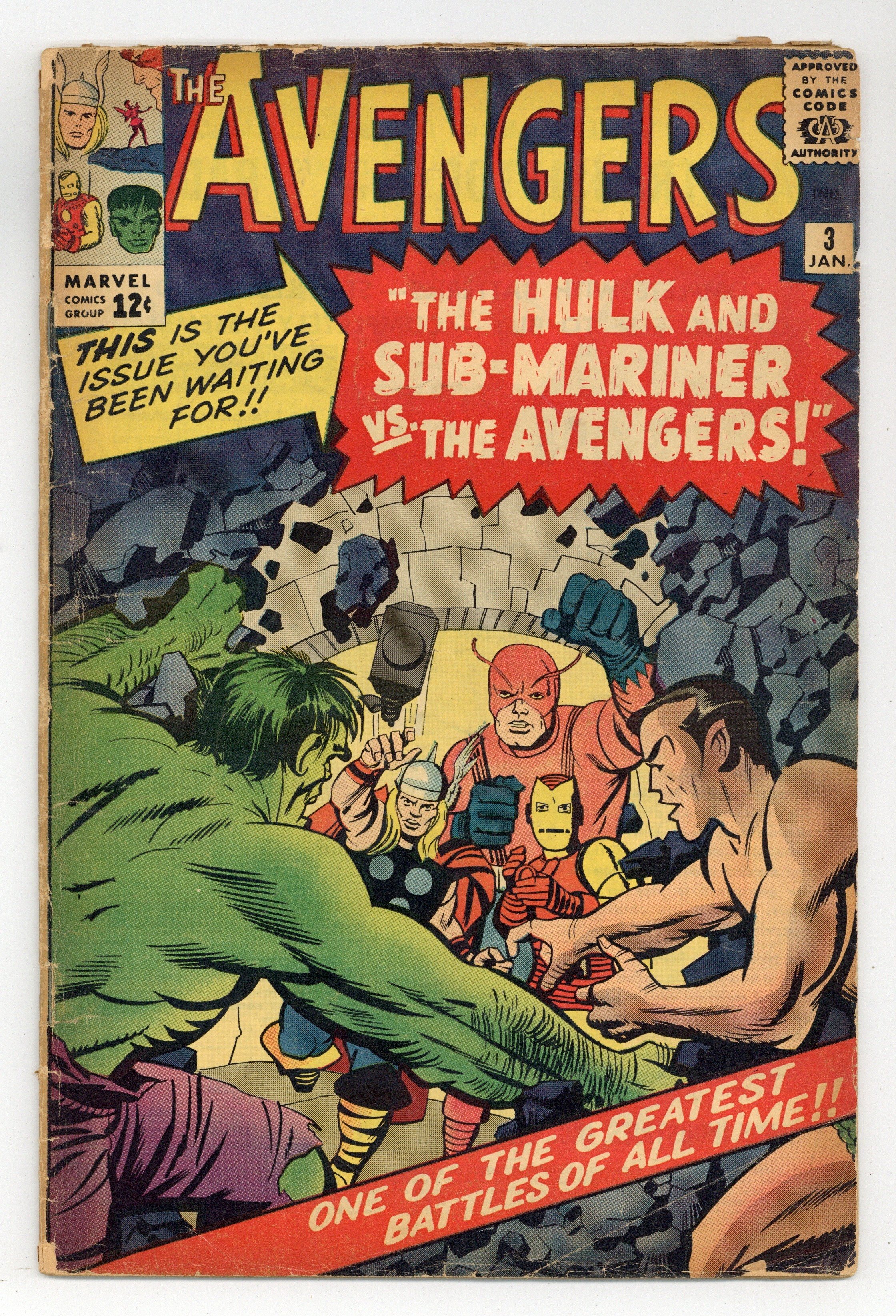 Cover pencils by Jack Kirby, inks by Paul Reinman. The Avengers Meet... Sub-Mariner!, script by Stan Lee, pencils by Jack Kirby, inks by Paul Reinman; After he left them, the Avengers feel responsible for the damages that the Hulk may cause; They start a search for him and find him. When they start to battle, the Sub-Mariner joins the Hulk. Roster includes: Thor, Giant-Man, Wasp, and Iron Man. Guest appearances by the Hulk, Rick Jones, the Sub-Mariner, the Fantastic Four, Spider-Man, the original X-Men, Odin, and miscellaneous Asgardians. 36 pgs. $0.12. Cover price $0.12.
