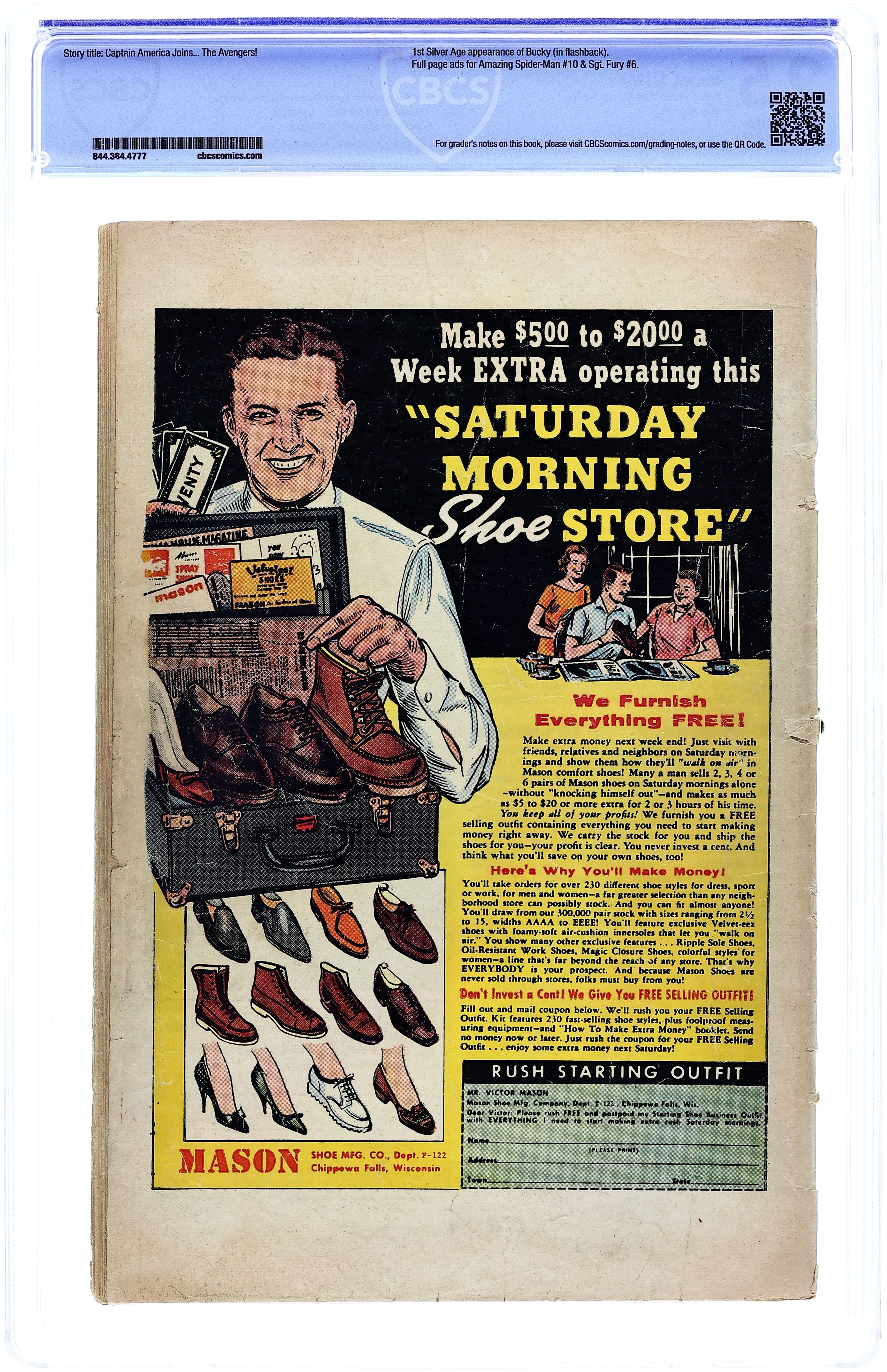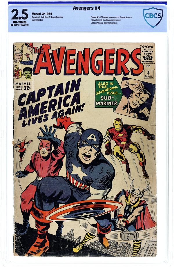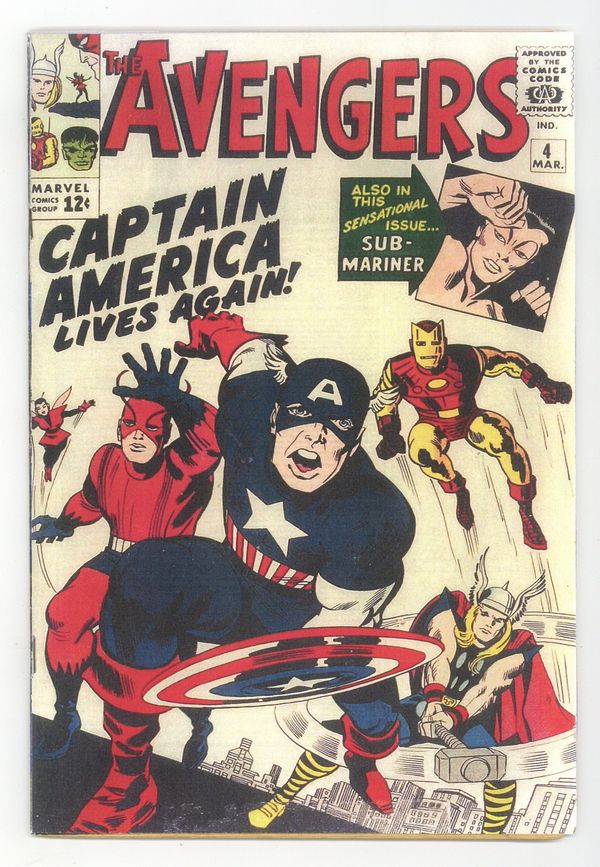 Cover pencils by Jack Kirby, inks by George Roussos. Captain America Joins... The Avengers!, script by Stan Lee, pencils by Jack Kirby, inks by George Roussos; Namor attacks a group of eskimos and throws their idol into the sea. When the ice melts, the figure trapped within turns out to be Captain America, in suspended animation since the end of World War II; The Avengers rescue Cap and return to New York. An alien figure turns our heroes to stone. When Cap and Rick Jones track him down, the alien agrees to restore the Avengers if they agree to help him recover his broken space ship in return; When doing so, the Avengers are attacked by Namor. Roster includes: Thor, Giant-Man, Wasp, Iron Man and Captain America. Rick Jones and Sub-Mariner appearances. First modern appearances of Captain America and Bucky. First appearance (shadowed cameo of face) of the first Baron Zemo. 36 pgs. $0.12. Cover price $0.12.
