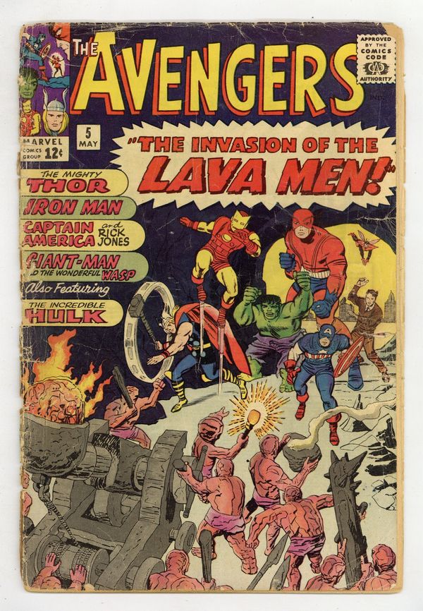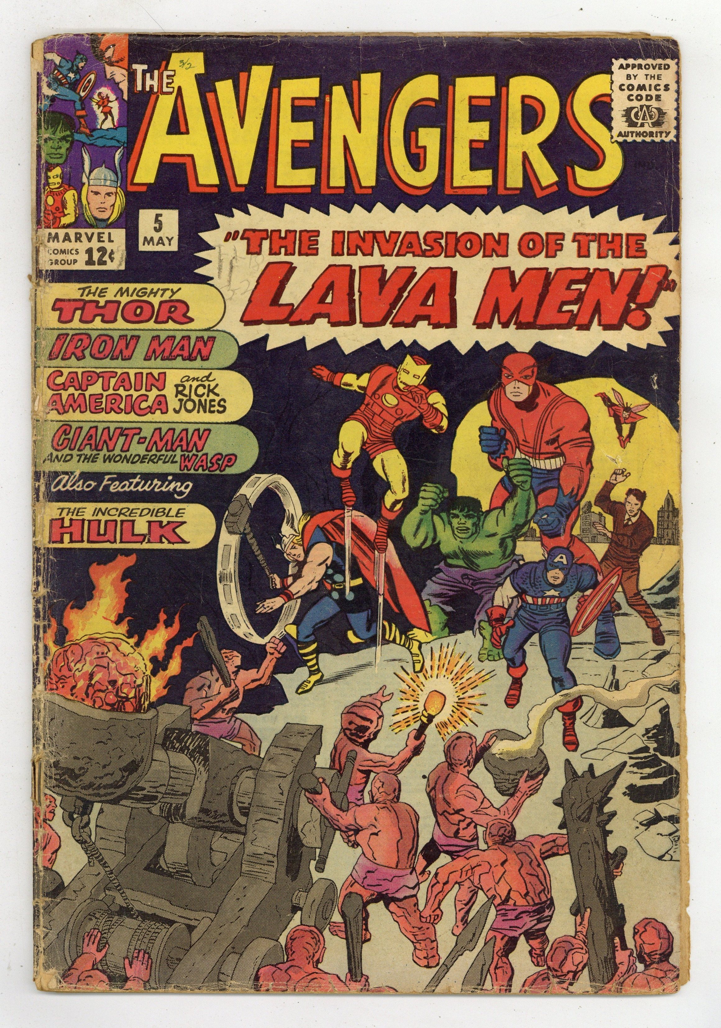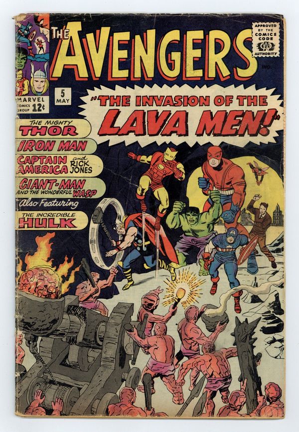 Cover pencils by Jack Kirby, inks by Vince Colletta. "The Invasion of the Lava Men!", script by Stan Lee, pencils by Jack Kirby, inks by Paul Reinman; The Avengers return to their mansion to inspect the damage caused by the battle with the Hulk; Days later, a mysterious high-pitched sound destroys a computer in one of Tony Stark's factories in Long Island and Iron Man is informed; Meanwhile, Giant-Man and the Wasp are conducting experiments inside of a large anthill; They are also affected by the noise and manage to escape before the anthill collapses; In his medical office, Don Blake reads about the effects of the noise in the newspaper; Thor meets up with Captain America and Rick Jones, who are training, and they witness another shockwave; The six heroes investigate the source of this new unknown threat; Meanwhile, in an army base in the west of the country, a strange rock breaks the surface of the earth, and soldiers investigate. Roster includes: Captain America, Thor, Iron Man, Wasp, and Giant-Man. Appearance by the Hulk. First letters page; letter to the editor from comics artist Alan Weiss. 36 pgs., full color. $0.12. Cover price $0.12.
