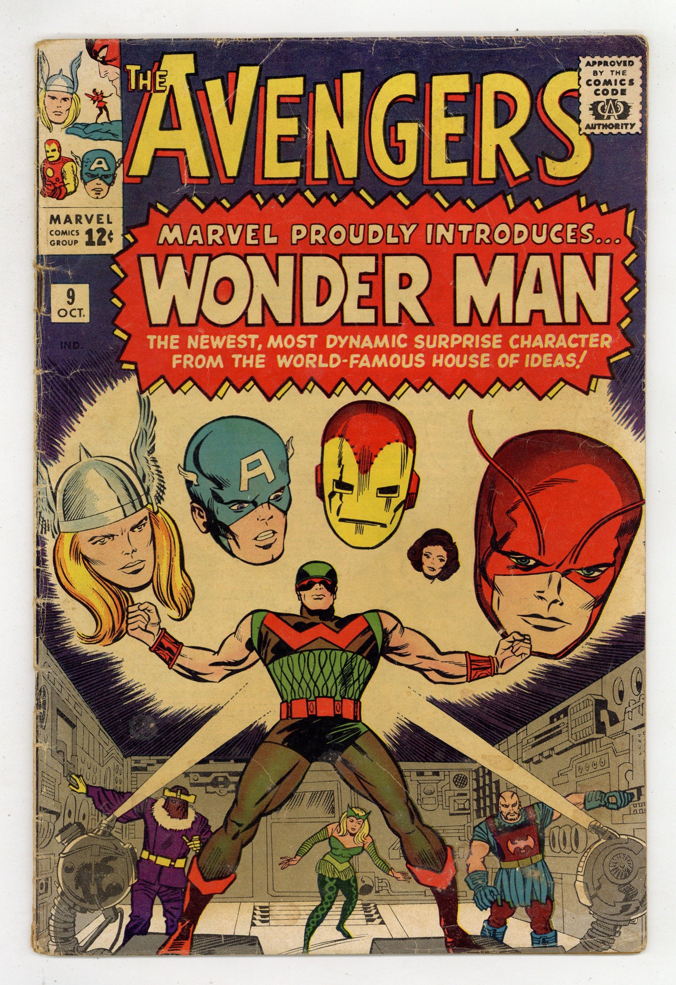Cover pencils by Jack Kirby, inks by Chic Stone. First appearance of Wonder Man in "The Coming of the... Wonder Man!", script by Stan Lee, pencils by Don Heck, inks by Dick Ayers; Baron Zemo and the Masters of Evil transform Simon Williams into Wonder Man and send him to infiltrate the Avengers; Instead, he winds up allying with them at the cost of his own life. Roster: Captain America, Thor, Iron Man, Giant-Man, and the Wasp. Villains: Executioner, the Enchantress, and Baron Zemo. Cameo appearance by Bucky. 36 pgs., full color. $0.12. Cover price $0.12.
