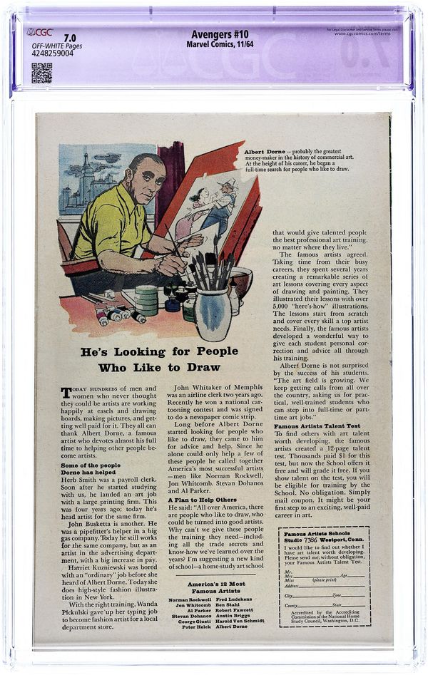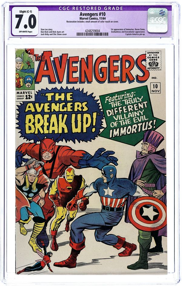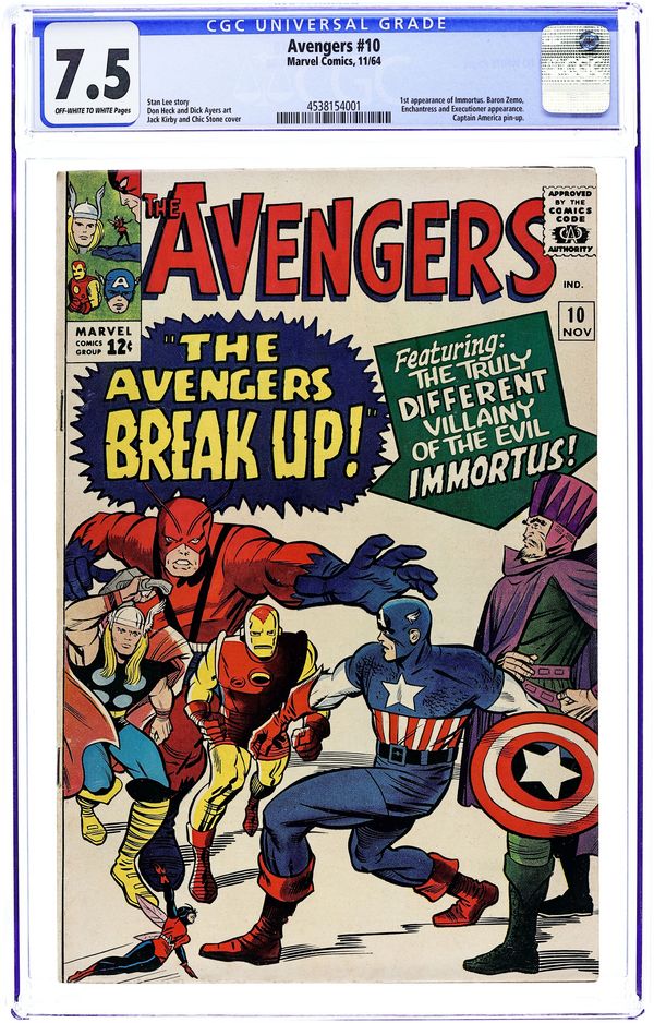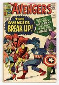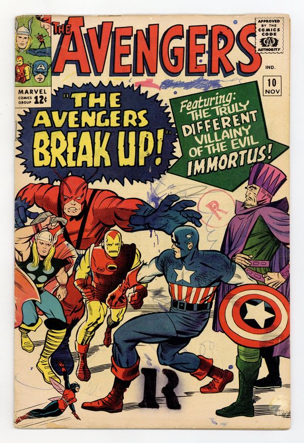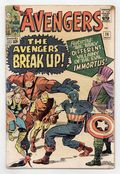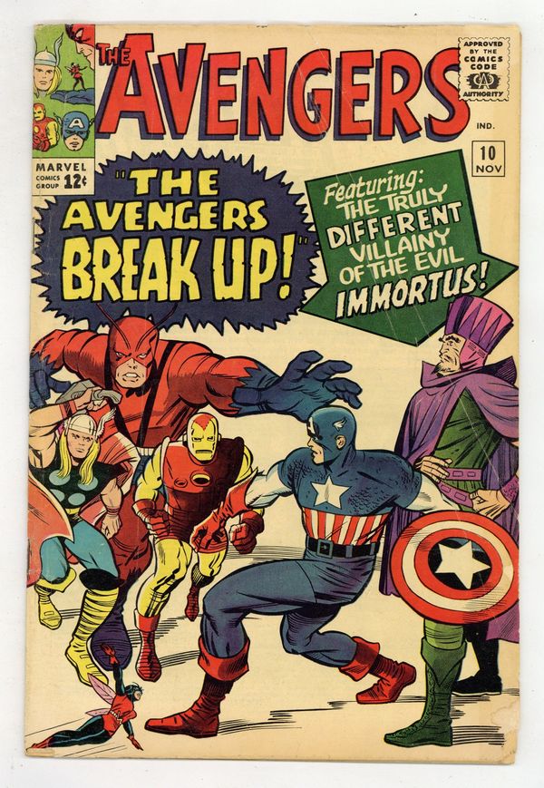 Cover pencils by Jack Kirby, inks by Chic Stone. First appearance of Immortus in "The Avengers Break Up!", script by Stan Lee, pencils by Don Heck, inks by Dick Ayers; Immortus appears before the Masters of Evil and demands to join them against the Avengers, using his control of the realm of Limbo to summon other powerful people from past ages to help them. Roster: Captain America, Thor, Iron Man, Wasp, Giant-Man, and Rick Jones. Villains: the Executioner, the Enchantress, Baron Zemo, and Kang. Letter to the editor from comics artist Gene Day. 36 pgs., full color. $0.12. Cover price $0.12.