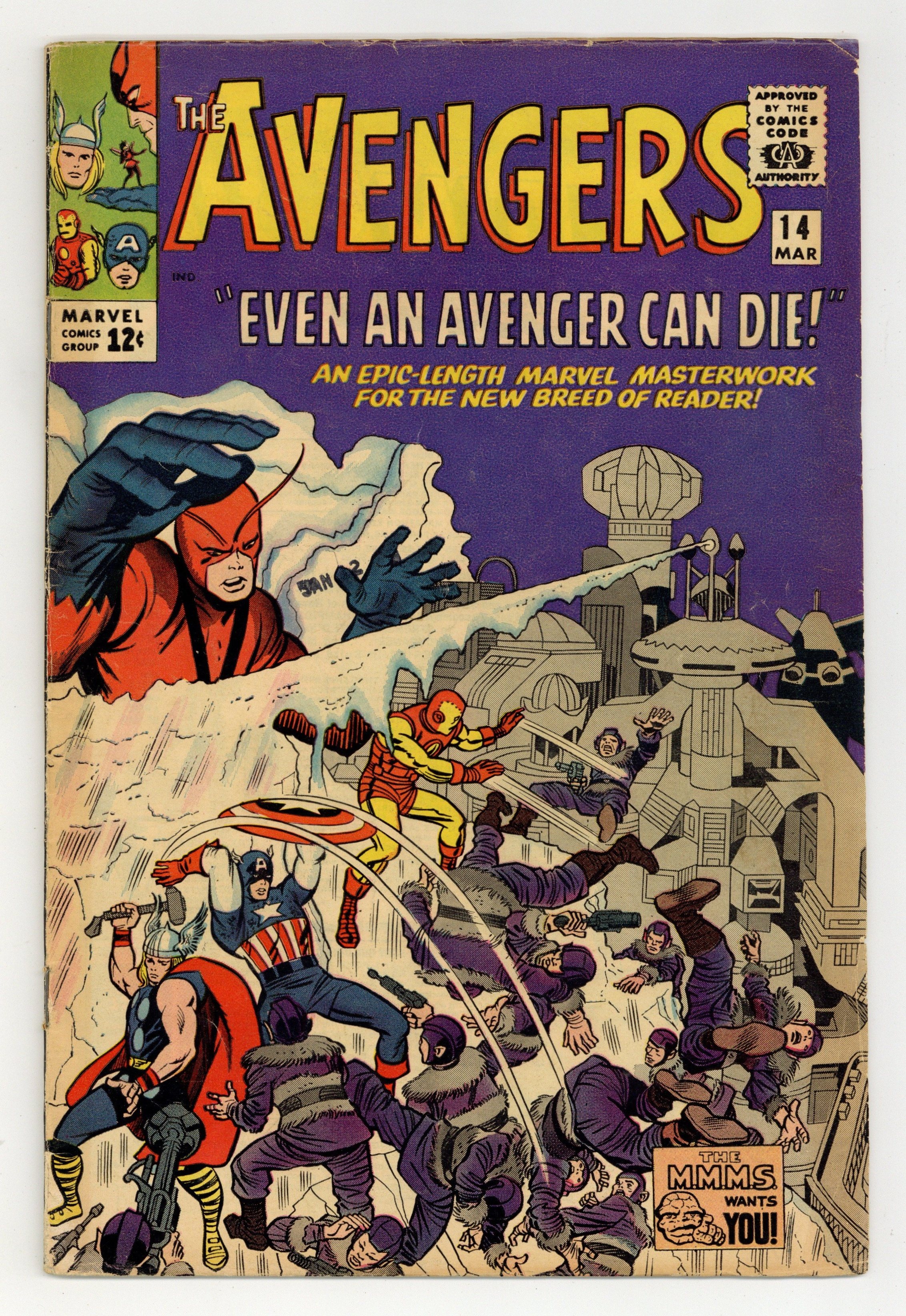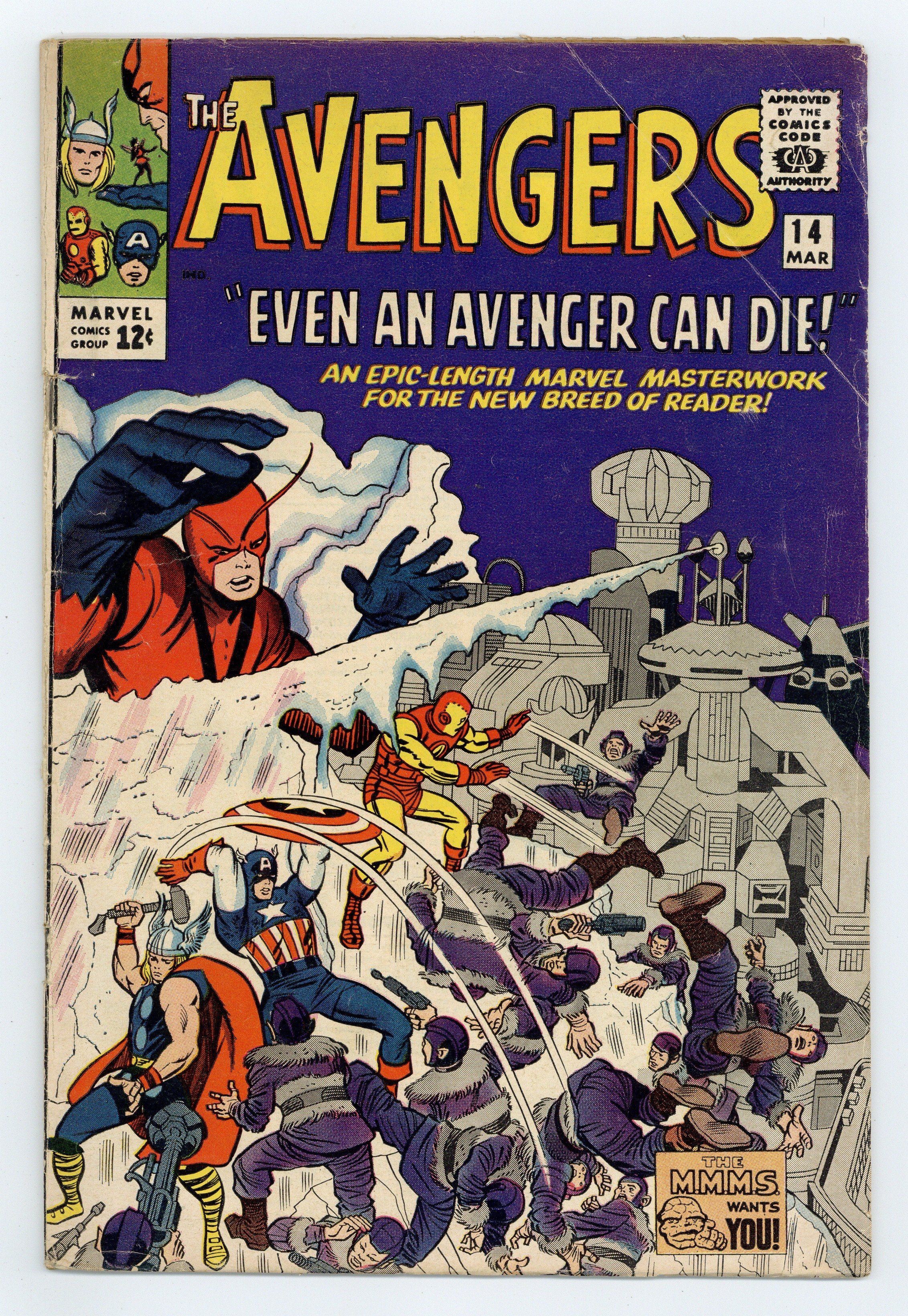 Cover pencils by Jack Kirby, inks by Chic Stone. Even Avengers Can Die!, script by Stan Lee (plot), Larry Ivie [as Paul Laiken] (script), and Larry Lieber (script), pencils by Jack Kirby (layouts) and Don Heck (pencils), inks by Chic Stone; In order to save the Wasp's life, the Avengers seek out the help of Dr. Svenson, only to find he's been replaced by an alien from the planet Kallu. Avengers Roll Call: Captain America, Thor, Iron Man, Giant Man, Wasp, and Rick Jones. First and only appearance of the villainous Ogor and the Kallusians. Guest appearance by the Watcher. Reprinted in Marvel Triple Action #8. 36 pgs. $0.12. Cover price $0.12.