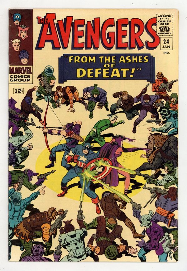 Starts Dec 15 Cover pencils by Jack Kirby, inks by Dick Ayers. "From the Ashes of Defeat - !", script by Stan Lee, pencils by Don Heck, inks by Dick Ayers; Kang's troops advance on the city as Kang escapes; Although hopeless, the Avengers decide to put up a fight against the never-ending army; Quicksilver is put out of action by a stray blast while trying to help a mother and child; The rest of the Avengers battle on but are eventually overwhelmed and captured; Although Kang's law states that monarchs conquered are to be executed, Kang wants to marry Ravonna; Meanwhile, Quicksilver is nursed back to health by the mother he saved; The rest of the generals led by Baltag rebel against Kang and try to assassinate him; Kang is then forced to team up with Captain America, Hawkeye and the Scarlet Witch to save Ravonna and liberate her civilization. Avengers Roll Call: Captain America, Hawkeye, Quicksilver, and the Scarlet Witch. Guest appearance by Princess Ravonna and Carelius. Reprinted in Marvel Triple Action #18. 36 pgs., full color. $0.12. Cover price $0.12.