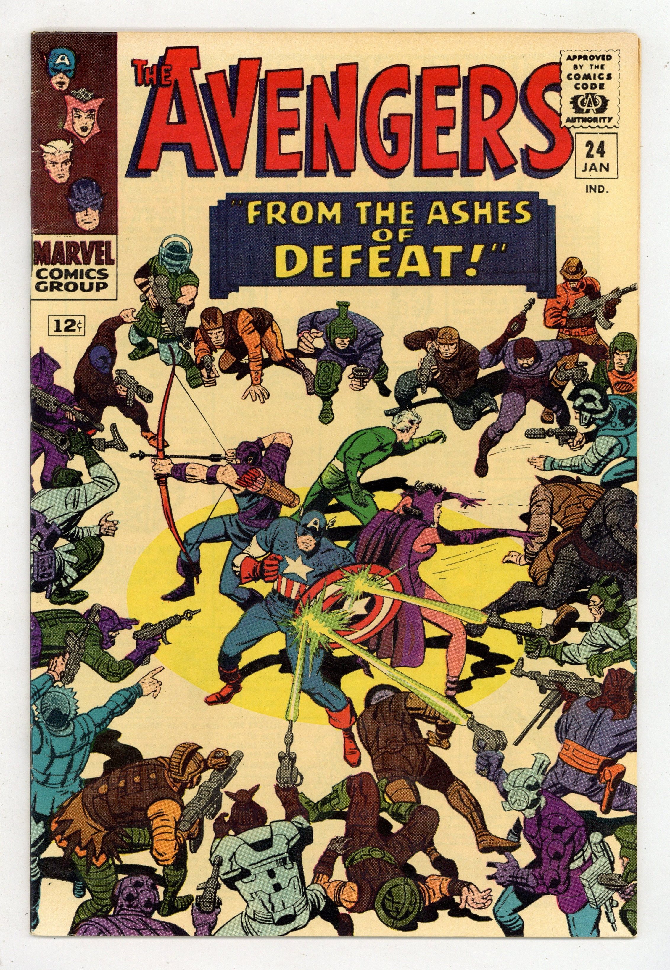 Starts Jan 3 Cover pencils by Jack Kirby, inks by Dick Ayers. "From the Ashes of Defeat - !", script by Stan Lee, pencils by Don Heck, inks by Dick Ayers; Kang's troops advance on the city as Kang escapes; Although hopeless, the Avengers decide to put up a fight against the never-ending army; Quicksilver is put out of action by a stray blast while trying to help a mother and child; The rest of the Avengers battle on but are eventually overwhelmed and captured; Although Kang's law states that monarchs conquered are to be executed, Kang wants to marry Ravonna; Meanwhile, Quicksilver is nursed back to health by the mother he saved; The rest of the generals led by Baltag rebel against Kang and try to assassinate him; Kang is then forced to team up with Captain America, Hawkeye and the Scarlet Witch to save Ravonna and liberate her civilization. Avengers Roll Call: Captain America, Hawkeye, Quicksilver, and the Scarlet Witch. Guest appearance by Princess Ravonna and Carelius. Reprinted in Marvel Triple Action #18. 36 pgs., full color. $0.12. Cover price $0.12.