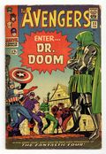 $110.00Cover pencils by Jack Kirby, inks by Dick Ayers. "Enter... Dr. Doom!", script by Stan Lee, pencils by Don Heck, inks by Dick Ayers; Scarlet Witch and Quicksilver recieve a letter from their Aunt in Latveria and decide to visit her; When they arrive they are jailed and discover it is a trap set up by Doctor Doom, who decides defeating the Avengers will instill fear in to the Fantastic Four,making them easy to defeat; The Fantastic Four attempt to assist the Avengers, but are not allowed, as interference could spark an international incident; Nevertheless, the Avengers escape and fight Doom to a standstill, where he causes a diversion and escapes. Avengers roll call: Captain America, Hawkeye, Quicksilver, and the Scarlet Witch. Guest appearance by the Fantastic Four. Letter to the editor from writer Steve Utley. Reprinted in Marvel Triple Action #19. 36 pgs., full color. $0.12. Cover price $0.12.