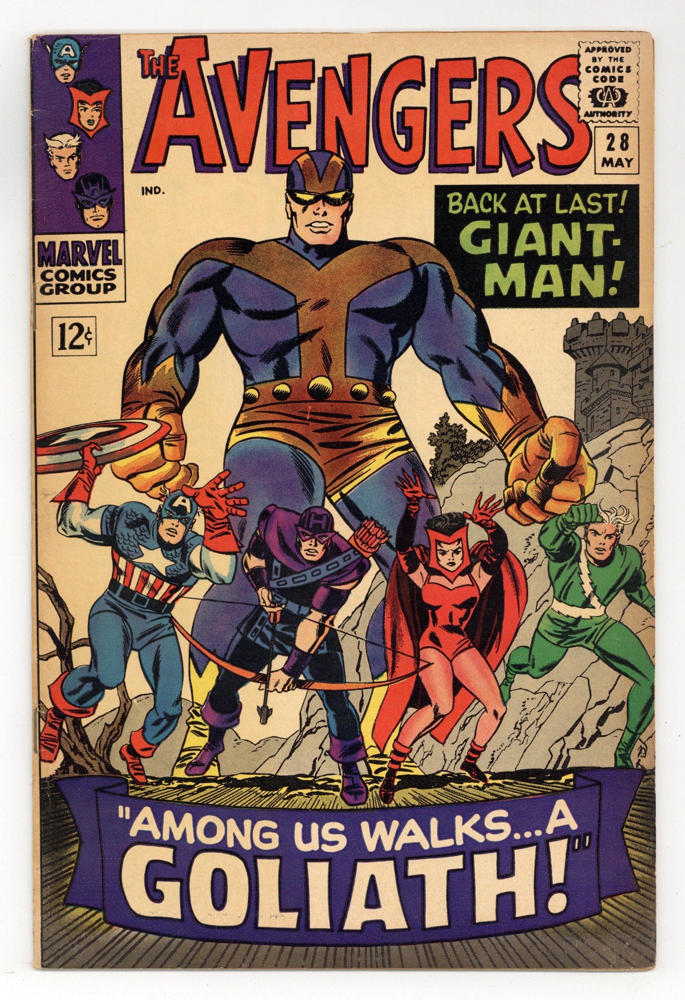 Cover pencils by Jack Kirby, inks by Frank Giacoia. Giant-Man becomes Goliath and, along with the Wasp, rejoins the Avengers in "Among Us Walks... a Goliath!", script by Stan Lee, art by Don Heck; Henry Pym calls the Avengers, saying the Wasp is missing, and that he is Giant-Man; The Wasp has been captured by the Collector and the Beetle; Giant-Man renames himself Goliath; They enter the Collector's lair and get separated and captured; Goliath escapes and frees the other Avengers; They rescue the Wasp and force the Collector to escape with the Beetle using a time machine; However, when Goliath tries to shrink down to his normal size he collapses and faints at 10 feet tall; First appearance of The Collector. Avengers roll call: Captain America, Hawkeye, Quicksilver, and the Scarlet Witch. Reprinted in Marvel Triple Action #22. 36 pgs., full color. $0.12. Cover price $0.12.