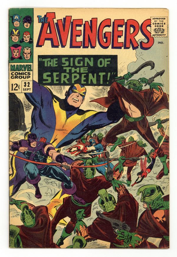 Tags: Marvel Legacy Numbering: Avengers (part 32), Avengers$15.25Cover by Don Heck. "The Sign of the Serpent!", script by Stan Lee, pencils by Don Heck; Captain America encourages Goliath to keep looking for a solution to his height-switching ability and finds a new assistant, Bill Foster; The Sons of the Serpent attack foreign people, including General Chen, the dictator of a communist country while he visits the UN; The Black Widow provides information to Hawkeye to prove herself to him. Quicksilver and the Scarlet Witch discover they will regain their full powers; Bill Foster, being African-American, gets attacked by the Sons of the Serpent; Captain America goes to Nick Fury for more information about them; The Avengers vow to defeat the Sons of the Serpent, but Captain America is kidnapped. Avengers roll call: Captain America, Hawkeye, Goliath, the Wasp, and, briefly, Quicksilver and the Scarlet Witch. Tony Stark (Iron Man) and Nick Fury guest appearances. Reprinted in Giant-Size Marvel Triple Action #2. 36 pgs., full color. $0.12. Cover price $0.12.