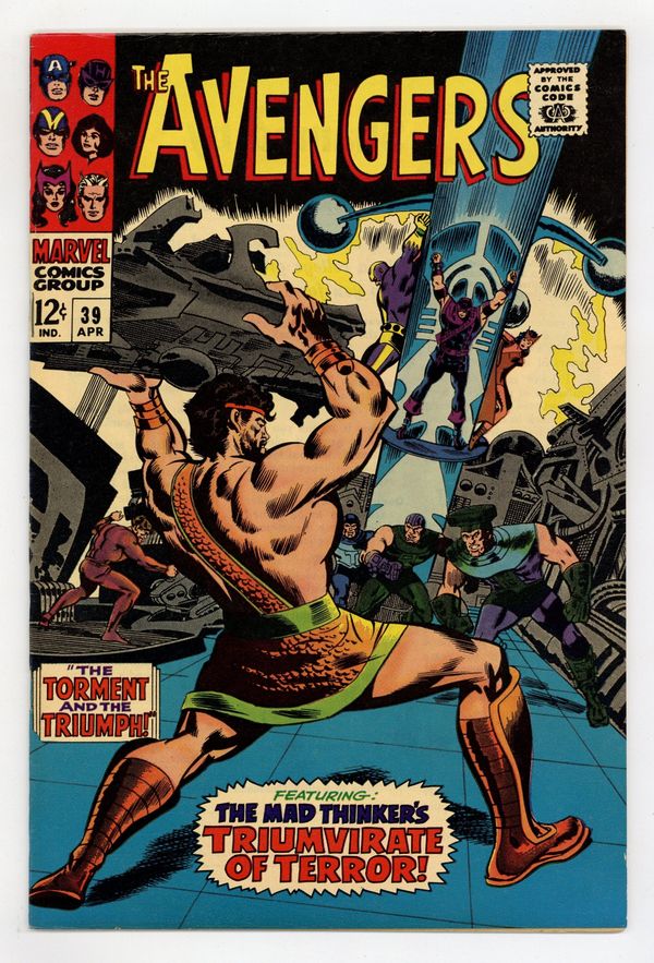 Starts Mar 16 "The Torment...and the Triumph!" Script by Roy Thomas. Pencils by Don Heck. Inks by George Roussos (as George Bell). Cover by Don Heck and George Roussos. After last issue's battle, the Lord of Olympus exiled Hercules to Earth for one year. So, the Avengers have a new associate or new teammate for the next 12 months! In the meantime, Hawkeye learns distressing news about the Black Widow. And he decides to go for a walk through the Lower East Side to clear his head. But the ace archer inadvertently walks right into a trap...set by the Mad Thinker! And it's only the beginning as the Mad Thinker sends Hammerhead, Piledriver, and Thunderboot to subdue Earth's Mightiest Heroes. The criminal genius' detailed plan works perfectly...until he encounters Olympus' mightiest hero! With his awesome strength, the Prince of Power disrupts the Mad Thinker's precise calculations -- and gives the Avengers a chance to rally and win! Cameo appearances by Nick Fury, Dum Dum Dugan, and Jasper Sitwell. Avengers Lineup: Goliath, Hawkeye, Hercules, Quicksilver, Scarlet Witch, and the Wasp. (Note: This issue was reprinted in Marvel Triple Action #31.) 36 pages. Cover price $0.12.