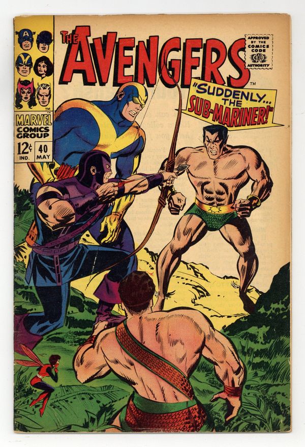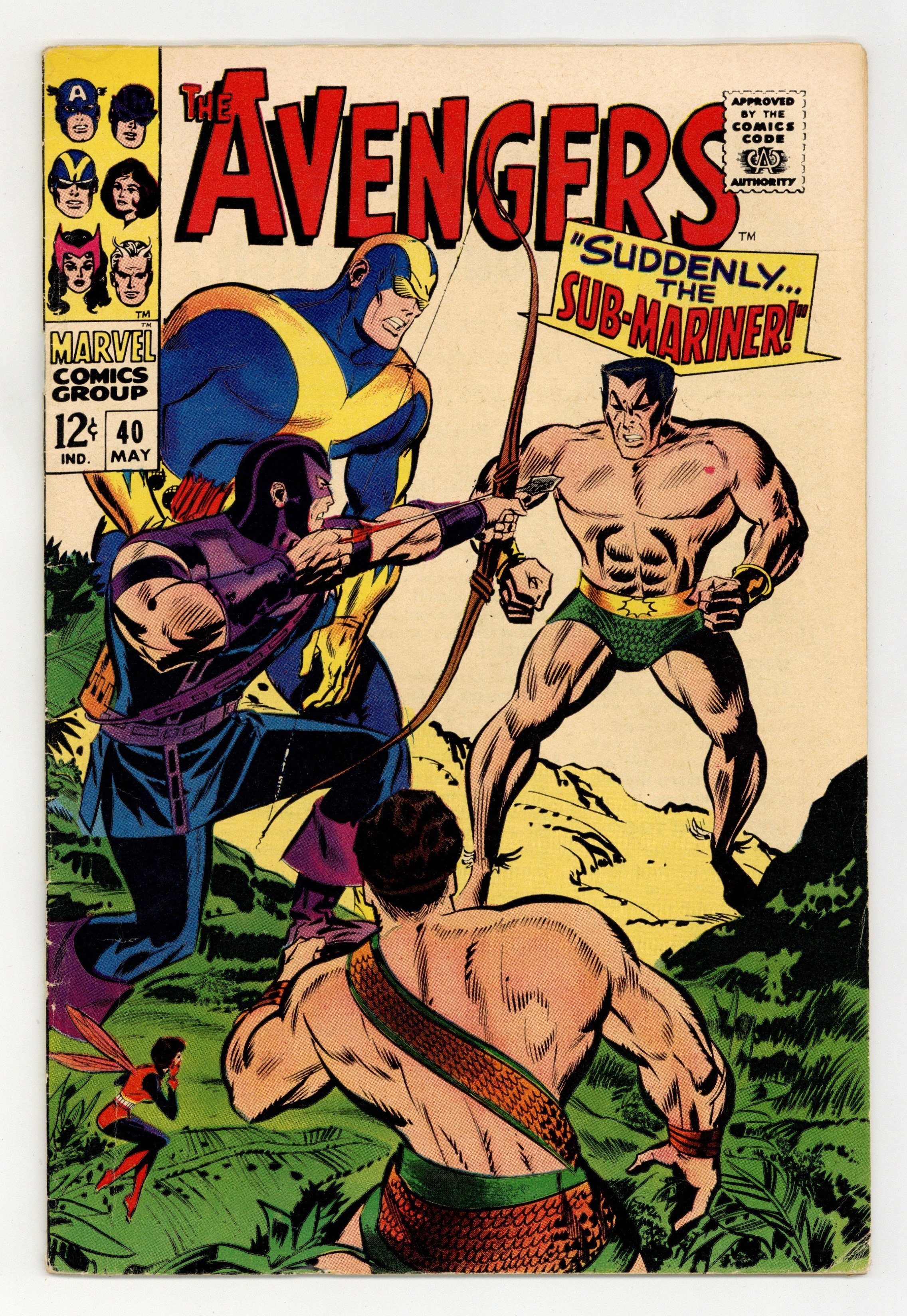 "Suddenly...the Sub-Mariner!" Guest-starring the Sub-Mariner. Script by Roy Thomas. Pencils by Don Heck. Inks by George Roussos (as George Bell). Cover by Don Heck. Earth's Mightiest Heroes clean up their mansion following their victory over the Mad Thinker. And while they do, a dramatic battle takes place in the Atlantic Ocean -- between a U.S. nuclear submarine and the Sub-Mariner! When the sub becomes trapped on the ocean floor, its commander sends an S.O.S. back to the mainland. And his message sets theAvengers on a collision course with the Prince of Atlantis -- and the cosmic cube! On a naval base in the Caribbean, the epic clash commences. Namor defeats Goliath, Hawkeye, and the Wasp; but one avenger still remains standing: the Lion of Olympus! In spectacular fashion Hercules and theAvenging Son wage war for possession of the cosmic cube! Will the Prince of Power or the Sub-Mariner attain victory? Imperious Rex! Cameo appearances by the Black Widow, Captain America, General Thunderbolt Ross, Lord Vashti,and the Mole Man. Avengers Lineup: Goliath, Hawkeye, Hercules, Quicksilver, Scarlet Witch, and the Wasp. (Note: This story was reprinted in Marvel Triple Action #32.) 36 pages. Cover price $0.12.