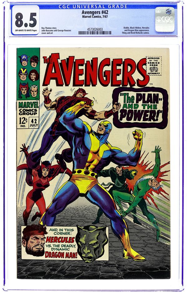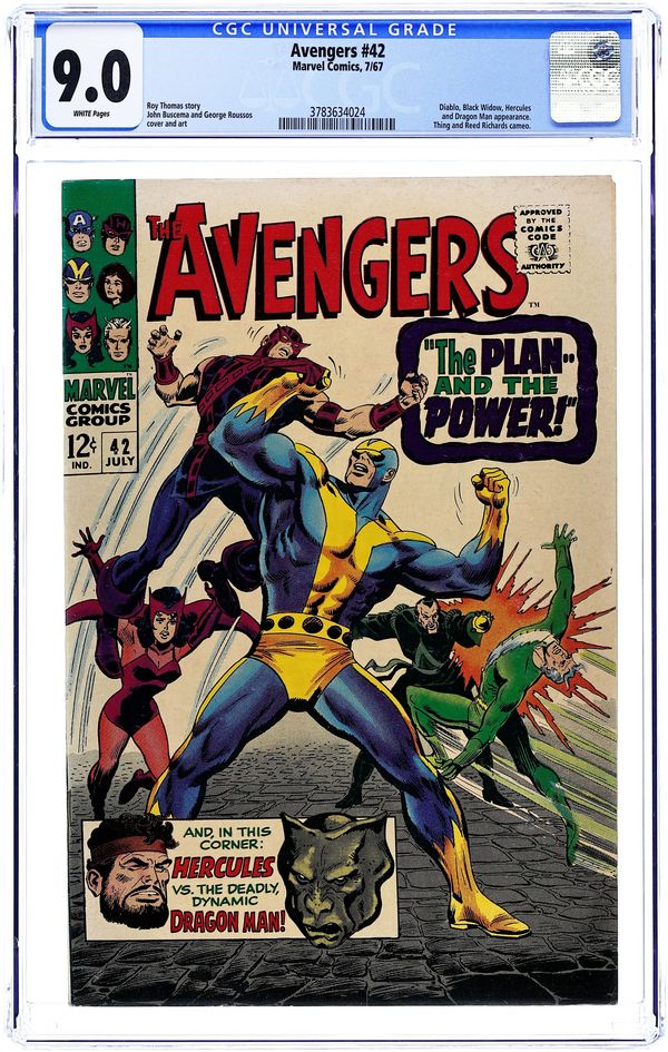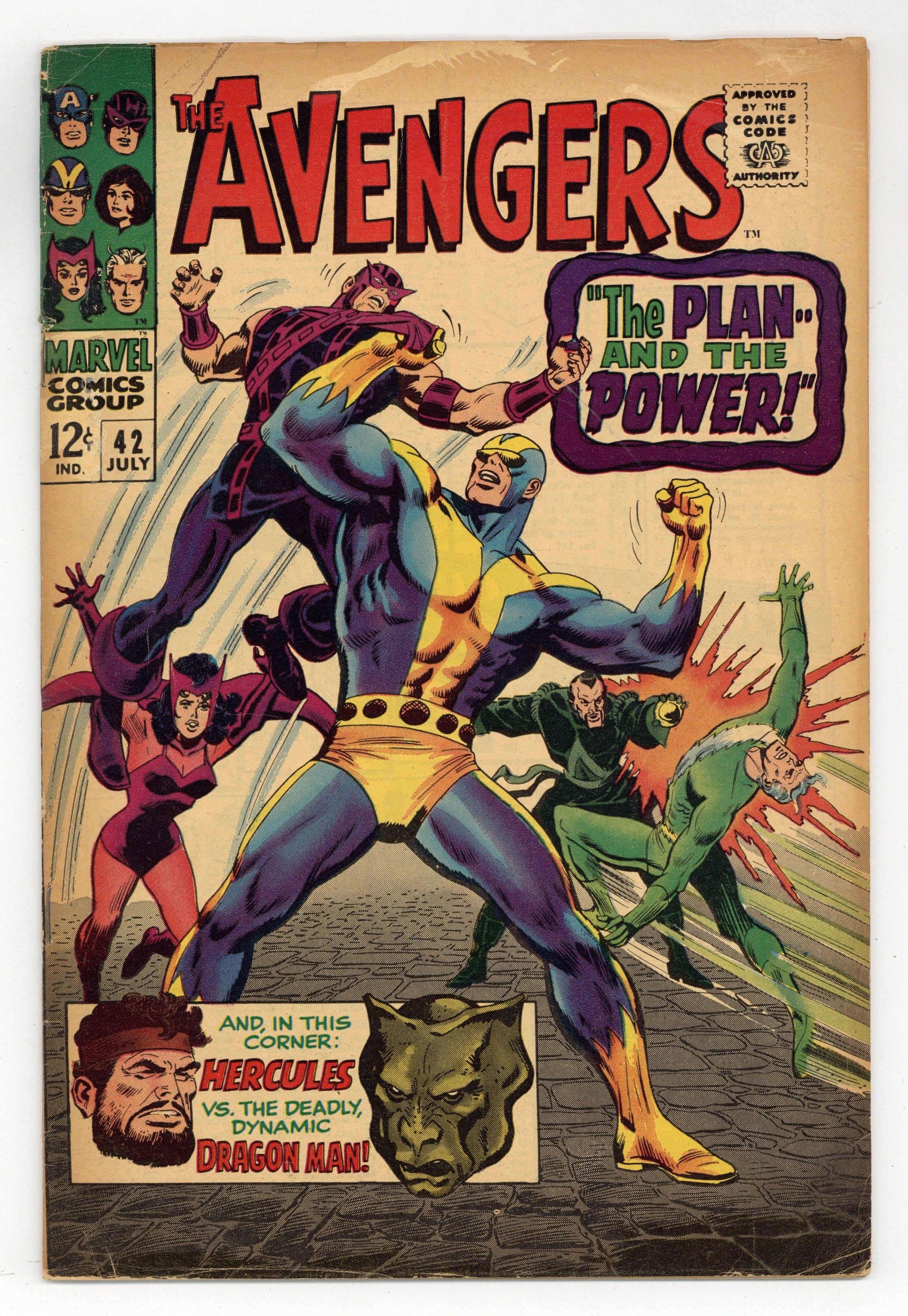 "The Plan and the Power!" Part 2 of 2. Script by Roy Thomas. Pencils by John Buscema. Inks by George Roussos (as George Bell). Cover by John Buscema and George Roussos. The Avengers are in disarray after going down to defeat to Diablo and the Dragon Man last issue. The Master of Alchemydeparted for Transylvania after his triumph -- and took Goliath and the Wasp with him. So after they regroup; Pietro, Wanda, and Hawkeye depart for Europe, and this time the Lion of Olympus joins them! Once the Avengers' aero-car lands, Hercules begins fighting Dragon Man, while the other heroes confront Diablo! The Master of Alchemy appears on his way to victory again...until a surprise avenger joins the fight! Thank goodness for the red, white, and blue! In the meantime, behind the Bamboo Curtain, the Black Widow tries to escape from her communist captors! Cameo appearances by Mr. Fantastic and the Thing. Avengers Lineup: Captain America, Goliath, Hawkeye, Hercules, Quicksilver, Scarlet Witch, and the Wasp. (Note: This story was reprinted in Marvel Triple Action #34.) 36 pages. Cover price $0.12.