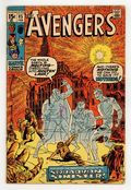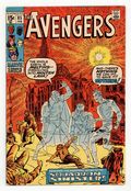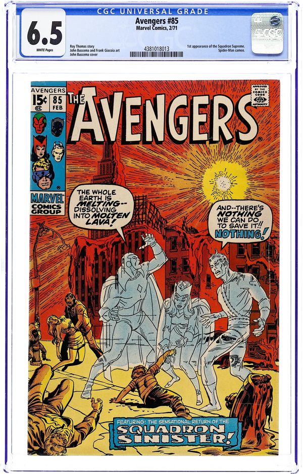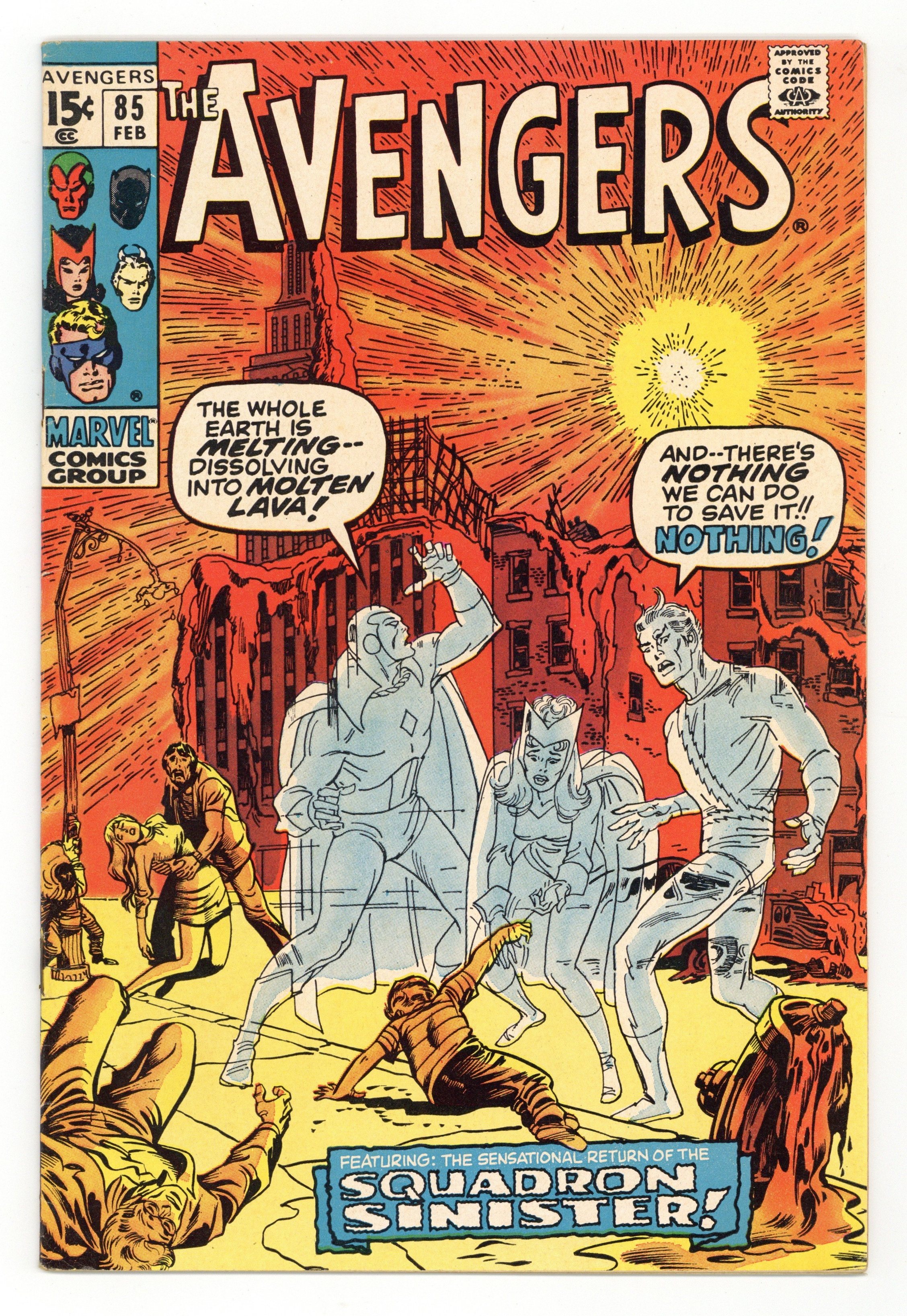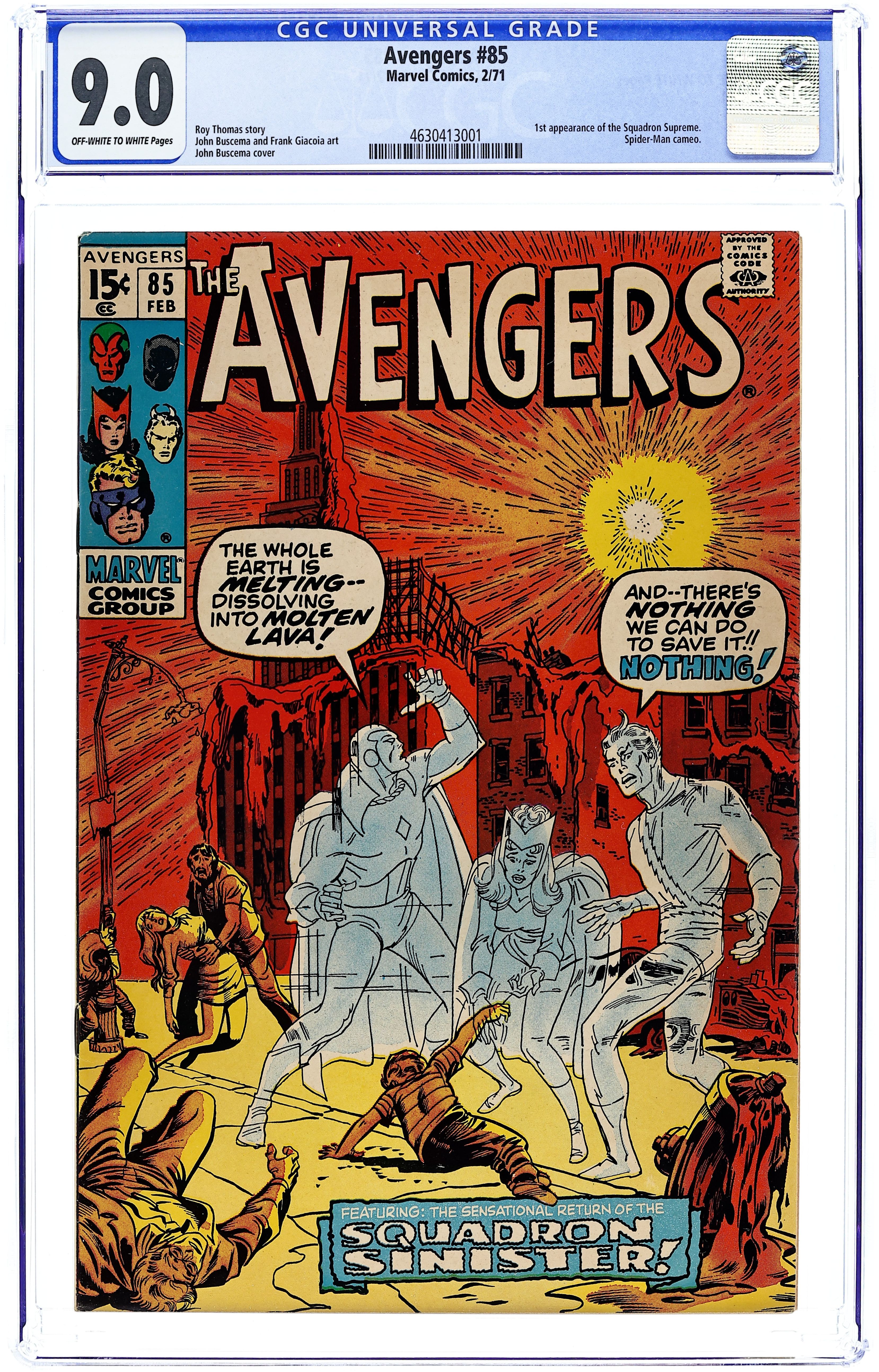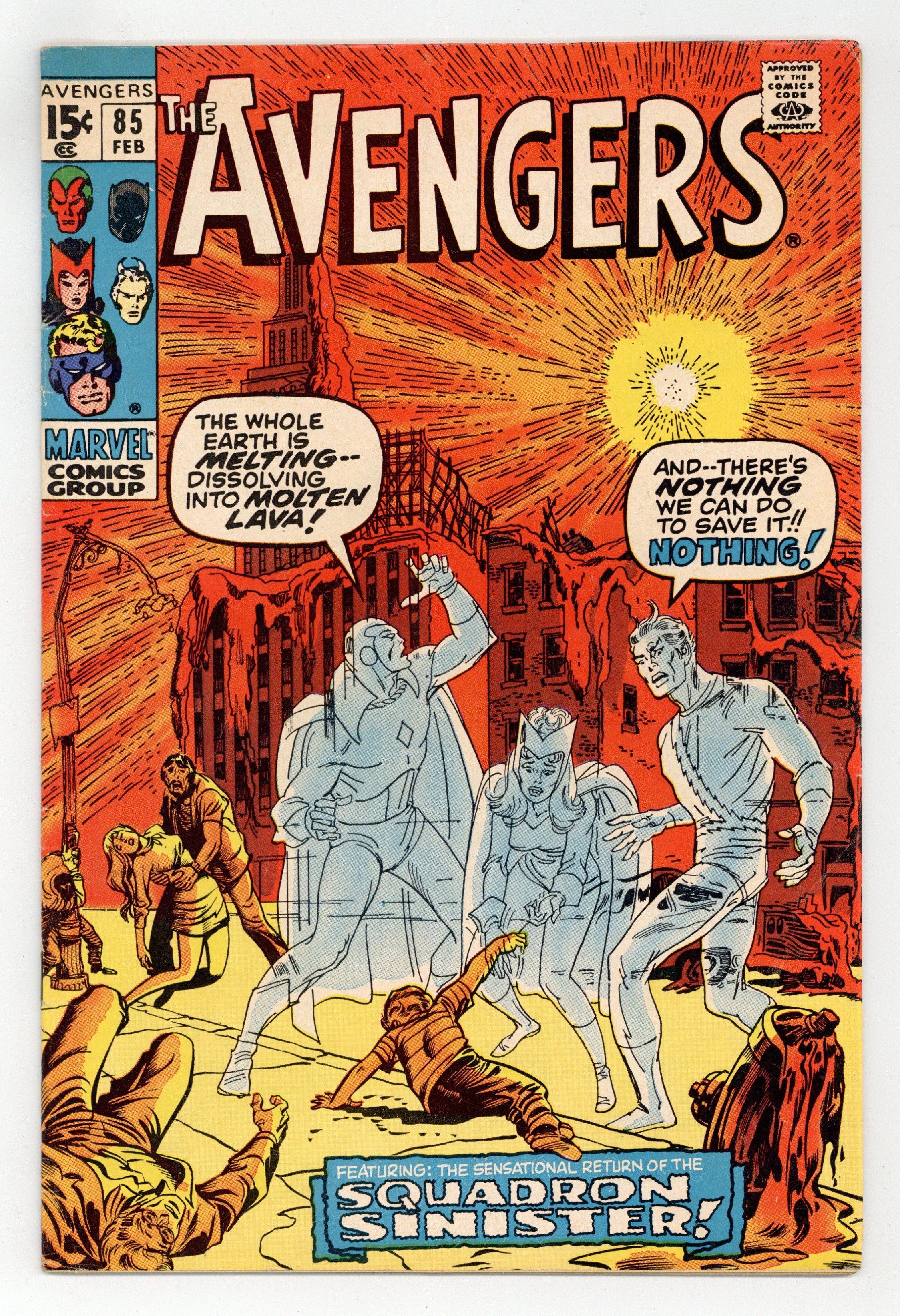 "The World is Not for Burning!" Part 1 of 2. First appearance of the Squadron Supreme. Script by Roy Thomas. Pencils by John Buscema. Inks by Frank Giacoia. Cover by John Buscema and Bill Everett. After concluding their amazing adventure on Polemachus, the Prince of Asgard uses his mighty mjolnir to sweep the Avengers back to Earth! Once the Vision, Goliath, Quicksilver, and the Scarlet Witch arrive at their Fifth Avenue headquarters; they look forward to rest and relaxation! But upon entering their familiar home, the tired quartet bumps into Nighthawk! Has the Squadron Sinister invaded the mansion?! No, the Avengers have apparently invaded someone else's mansion! What? In a bizarre twist of fate, the extra-dimensional jump from Polemachus went awry! Earth's Mightiest Heroes have landed on a parallel Earth with a different superhero team: the Squadron Supreme! When the two teams meet, cooler heads don't prevail! And the Mighty Avengers test their mettle vs. the Squadron Supreme! Cameo appearances by the Black Knight, Black Panther, Captain America, Spider-Man, Thor, Doctor Spectrum, Hyperion, and the Whizzer. Squadron Supreme Lineup: American Eagle, Hawkeye (aka the Golden Archer), Lady Lark, Nighthawk, and Tom Thumb. Avengers Lineup: Goliath, Quicksilver, Scarlet Witch, and the Vision. (Notes: The Squadron Supreme's Earth was later designated Earth-712. The cover indicates that the Squadron Sinister (from Avengers 71) has returned; however, it's the Squadron Supreme that appears for the first time in this issue.) 36 pages. Cover price $0.15.