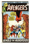 $23.50"More Than Inhuman!" Part 6 of 9. Guest-starring Captain Marvel. Script by Roy Thomas. Pencils by Neal Adams and John Buscema. Inks by Tom Palmer. Cover by Neal Adams and Tom Palmer (with John Romita touch-ups). After capturing Captain Marvel, Quicksilver, and the Scarlet Witch last issue; the victorious Super-Skrull pilots his spacecraft to the Himalayas to destroy the Inhumans! But the Vision's interference and the impenetrable dome over the Great Refuge thwart the evil skrull's plan! Frustrated by his failure, the Super-Skrull space warps to the Skrull Throneworld with his three super-powered captives in tow! Meanwhile at Avengers Mansion, Earth's Mightiest Heroes work feverishly to develop a counterpunch for the Kree and the Skrulls! But their most pressing problem turns out to be the Alien Activities Commission and the Mandroids! The Mighty Avengers are stuck...moving at the speed of government! First appearance of the Mandroids. Cameo appearances by Nick Fury, Triton, Mr. Fantastic, and the Thing. Avengers Lineup: Captain America, Goliath, Iron Man, Quicksilver, Scarlet Witch, Thor, and the Vision. First 20¢ issue. 36 pages. Cover price $0.20.